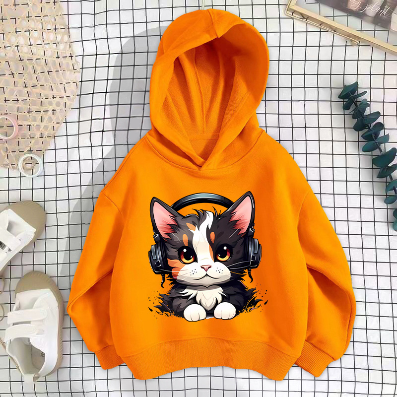 • 오렌지색 이어폰 고양이 스웨트셔츠 얇은 스타일