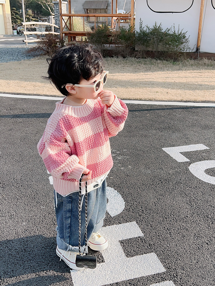 두꺼운 유행 소년의 줄무늬 핑크 스웨터 2024 봄과 가을 한국 스타일 아기의 유행 최고 어린이 스웨터