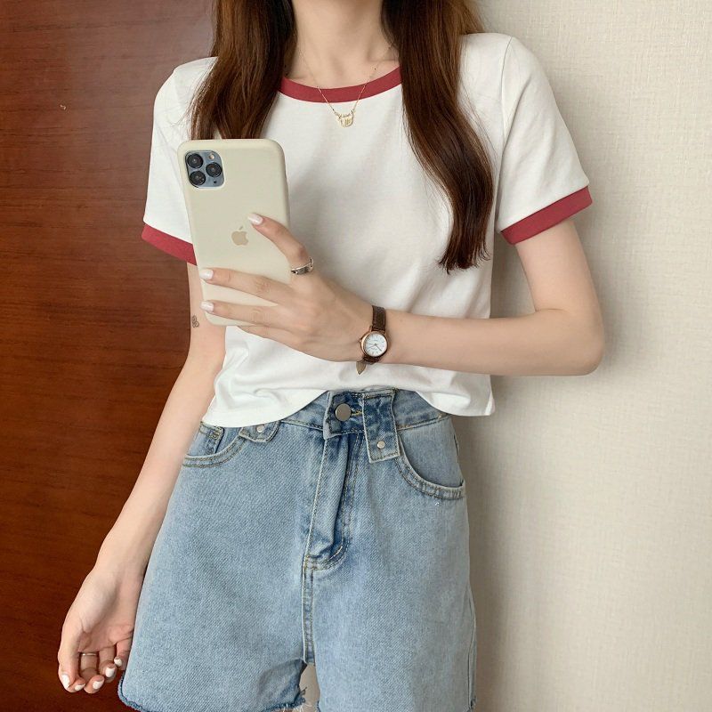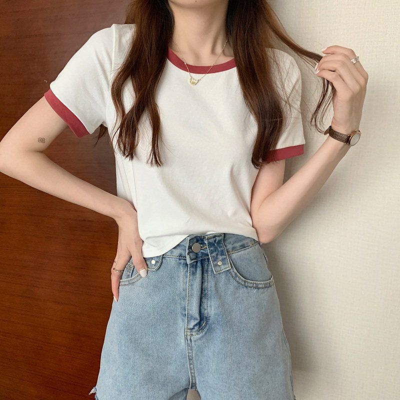여성을위한 대비 색 라운드 넥 반팔 티셔츠 2025 새로운 여름 바닥 셔츠 한국 스타일 슬림 짧은 학생 탑 유행스토어 가기