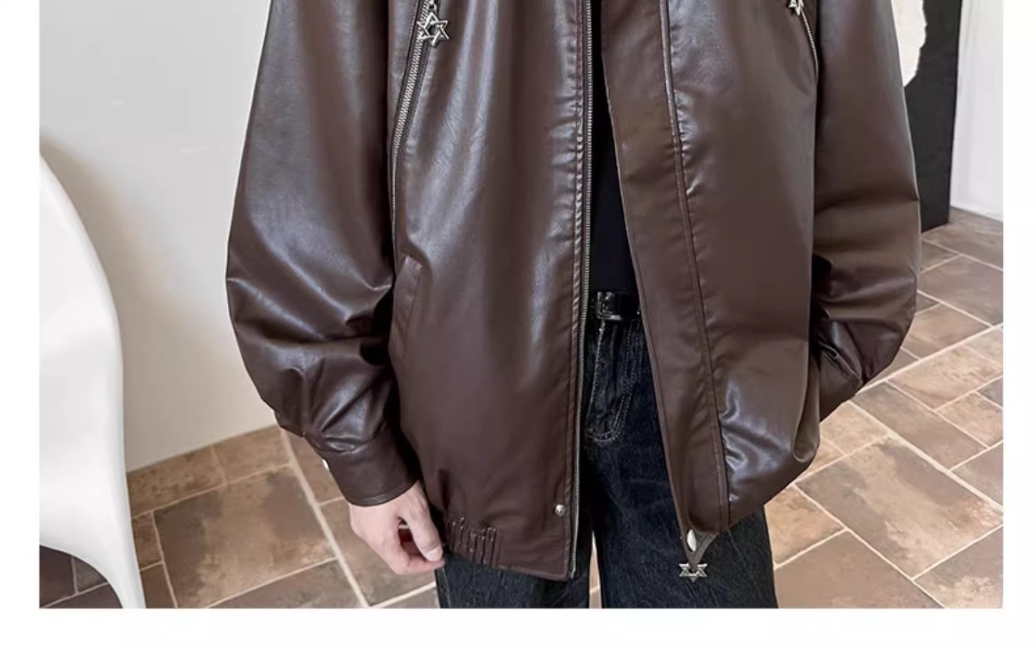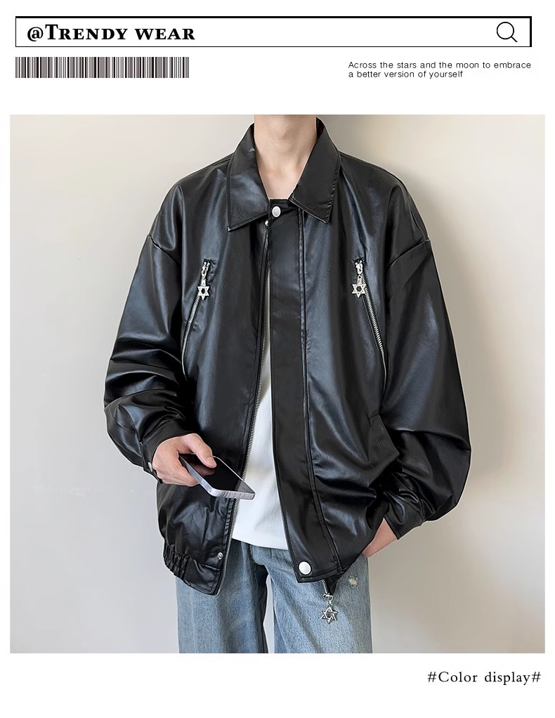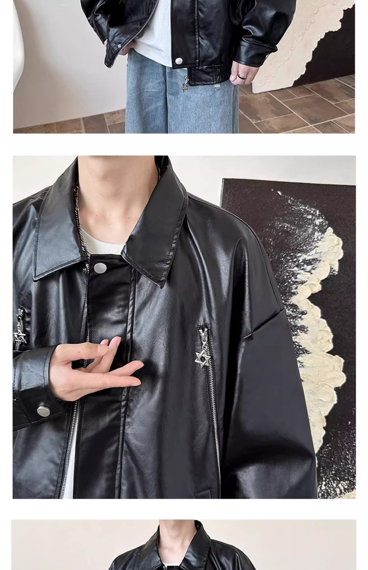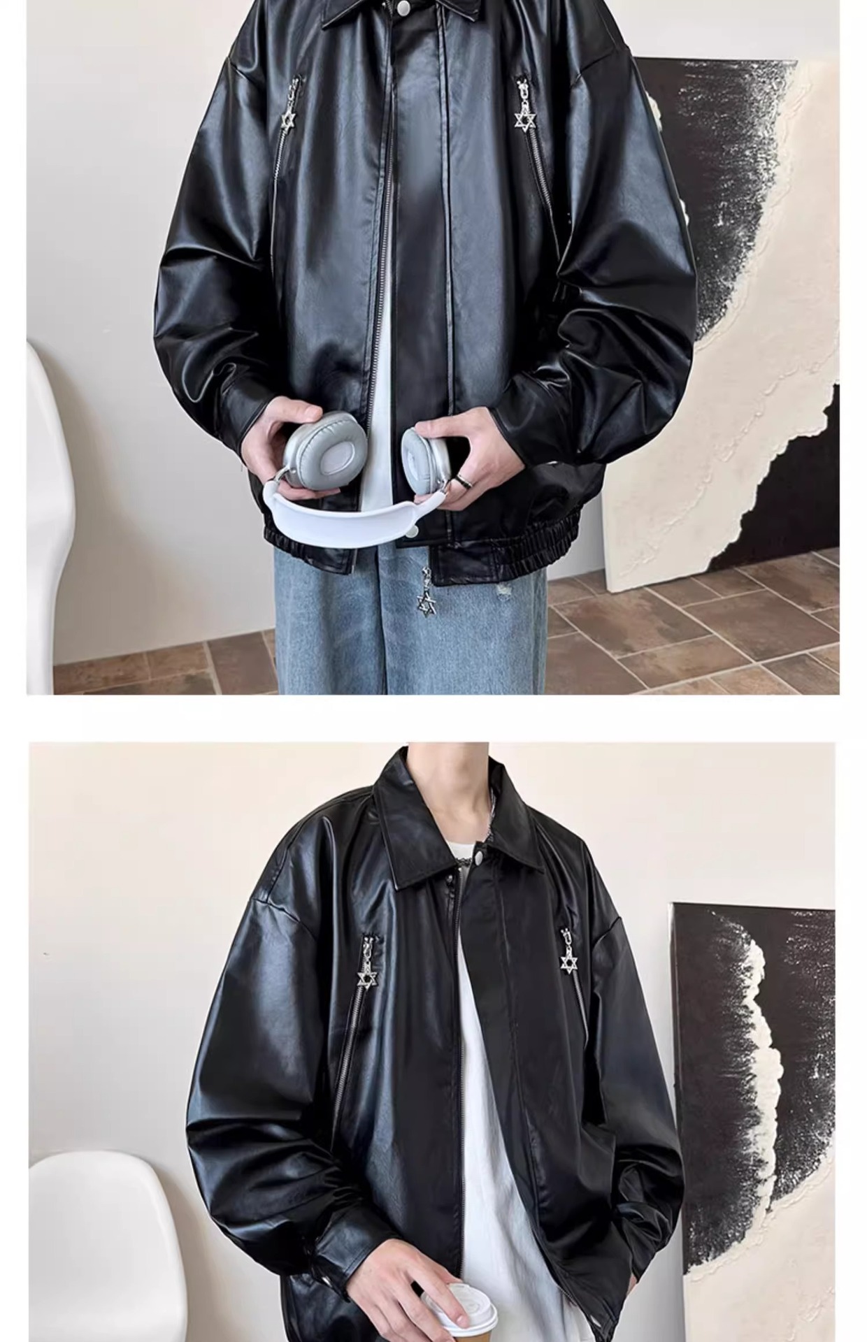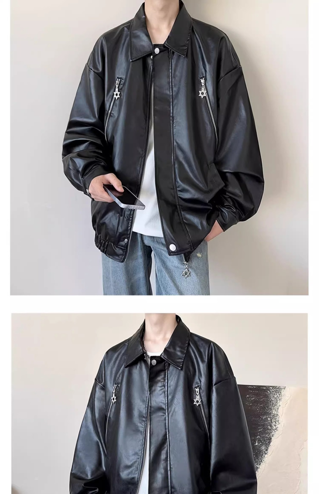 NASA 스타 지퍼 PU 가죽 자켓 남자의 봄과 가을 새로운 어두운 미국 스타일 뜨거운 오토바이 단색 옷깃 재킷스토어 가기