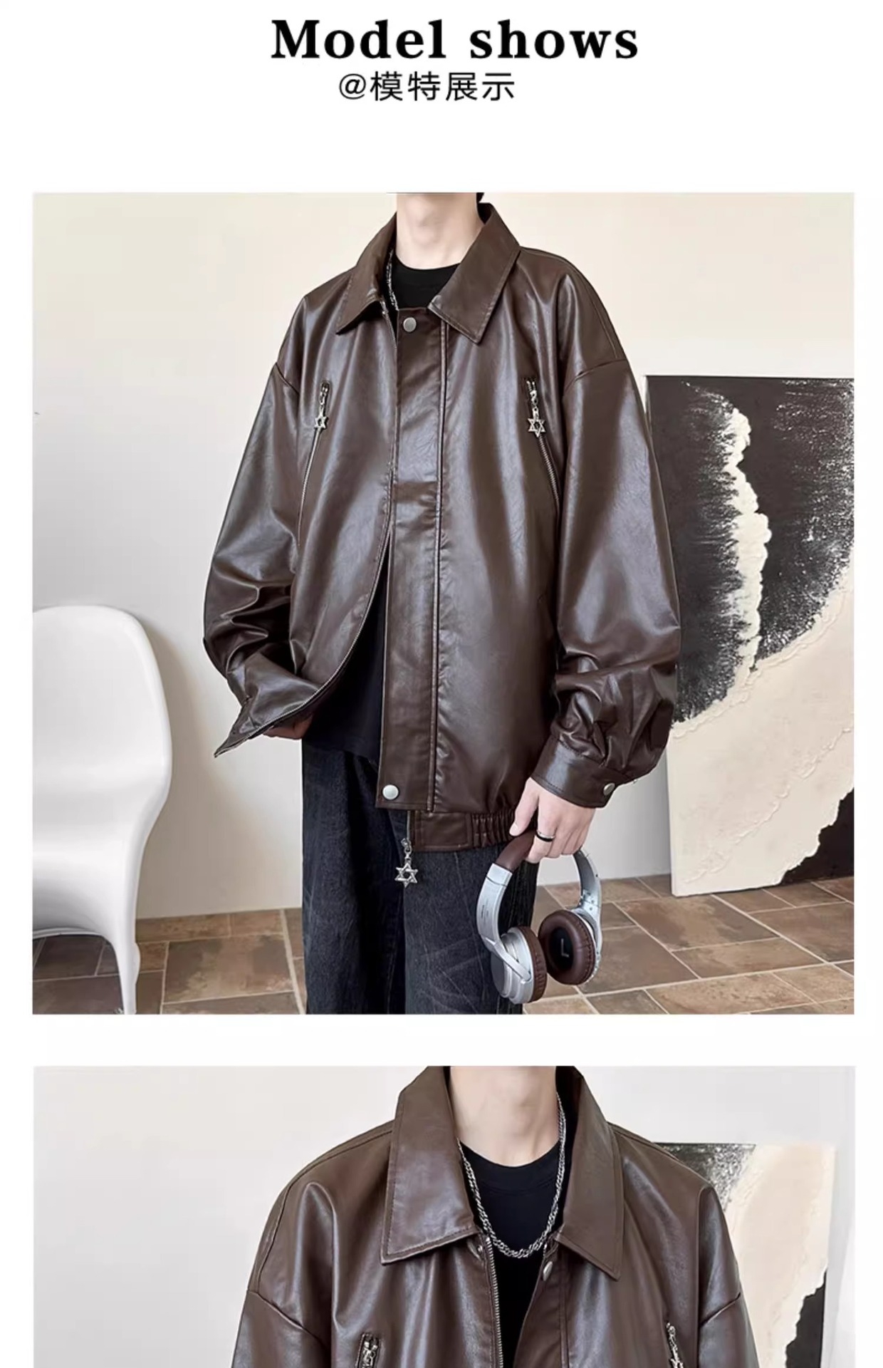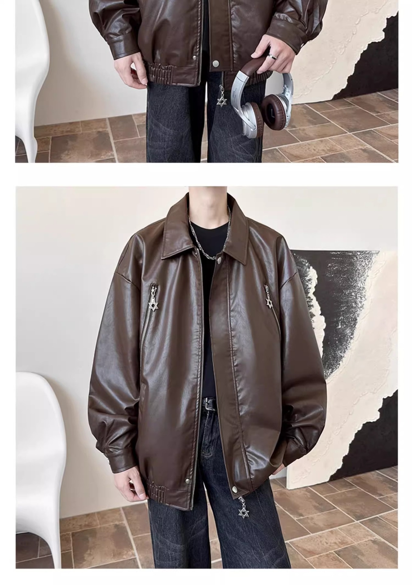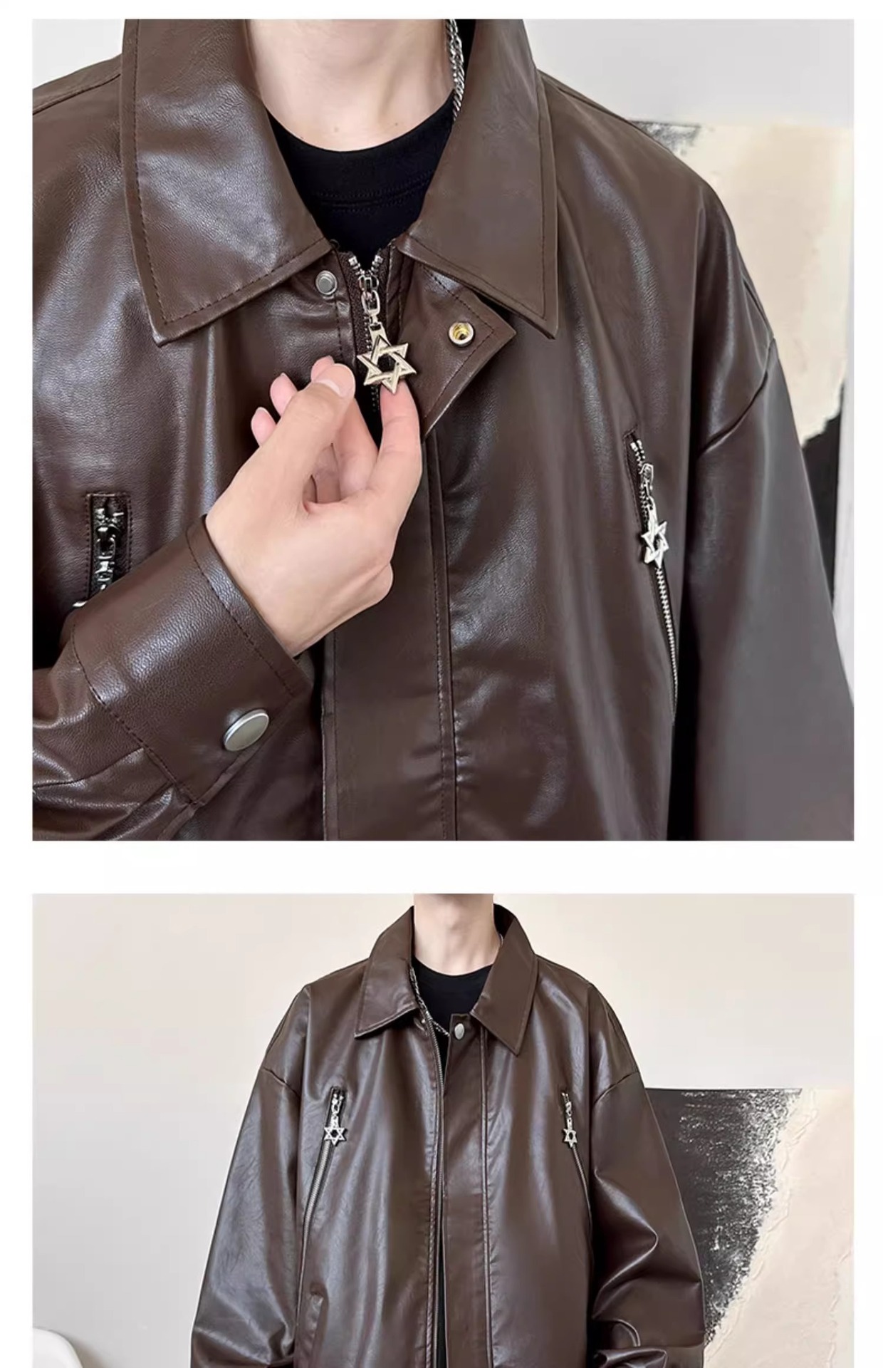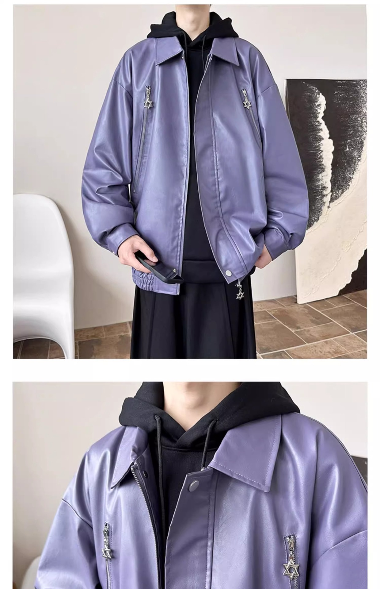 NASA 스타 지퍼 PU 가죽 자켓 남자의 봄과 가을 새로운 어두운 미국 스타일 뜨거운 오토바이 단색 옷깃 재킷스토어 가기