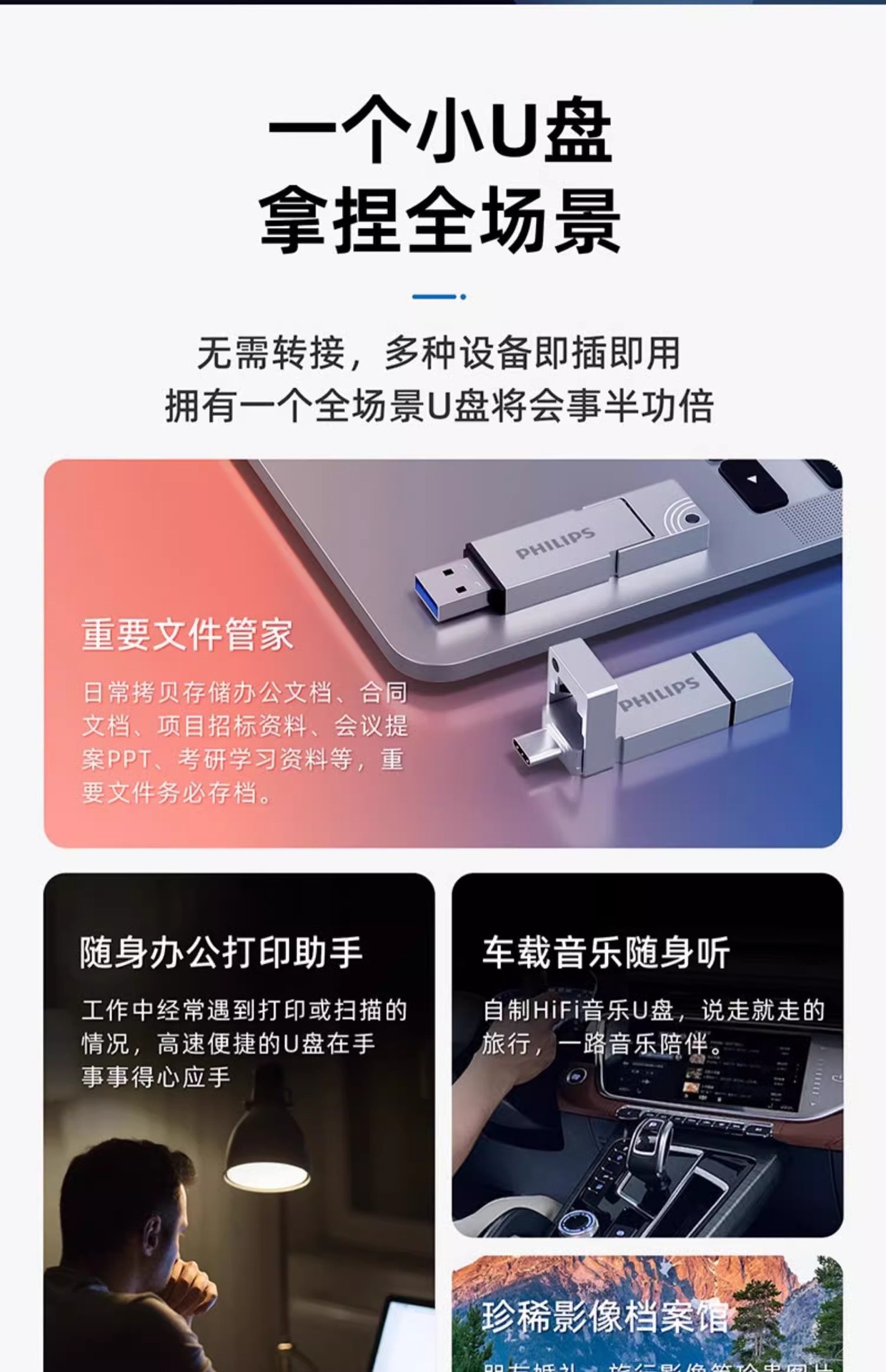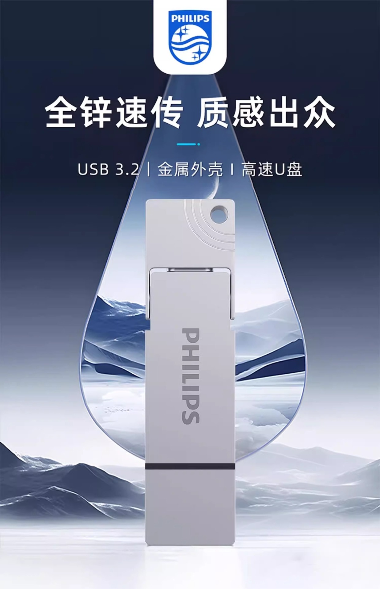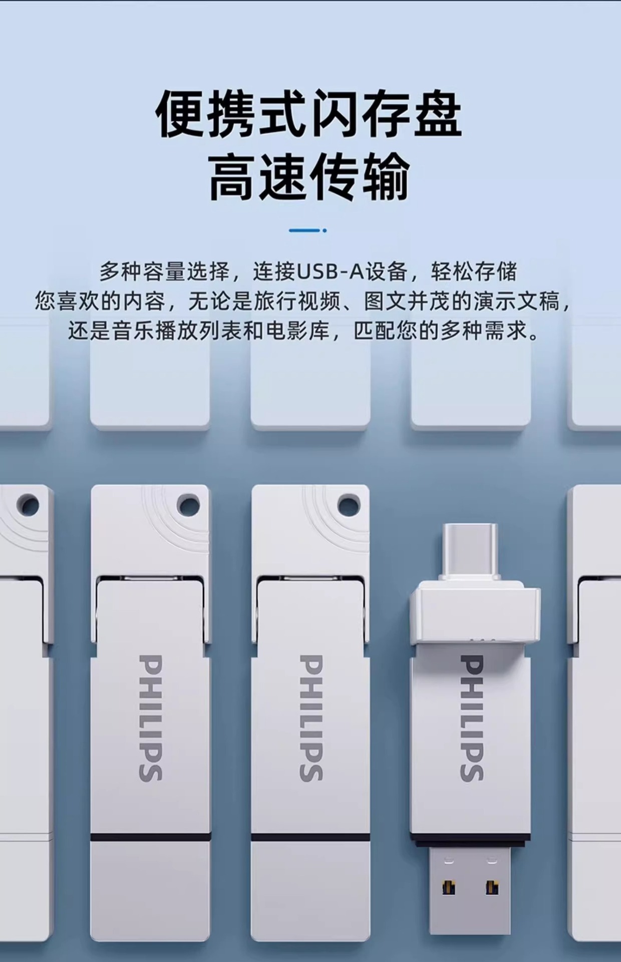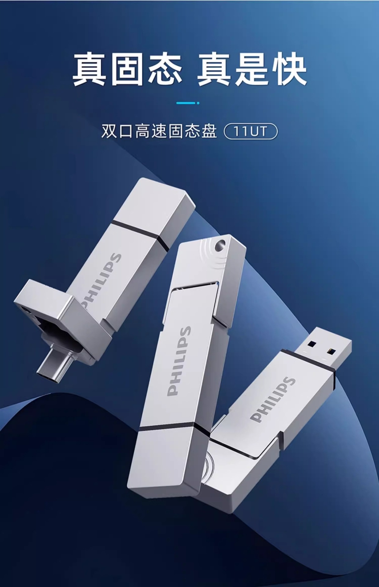 필립스 솔리드 스테이트 U 디스크 듀얼 인터페이스 휴대 전화 컴퓨터 듀얼 사용 USB 고속 대용량 금속 오피스 U 디스크 도매스토어 가기