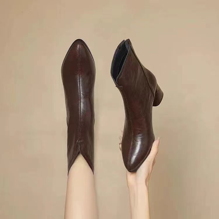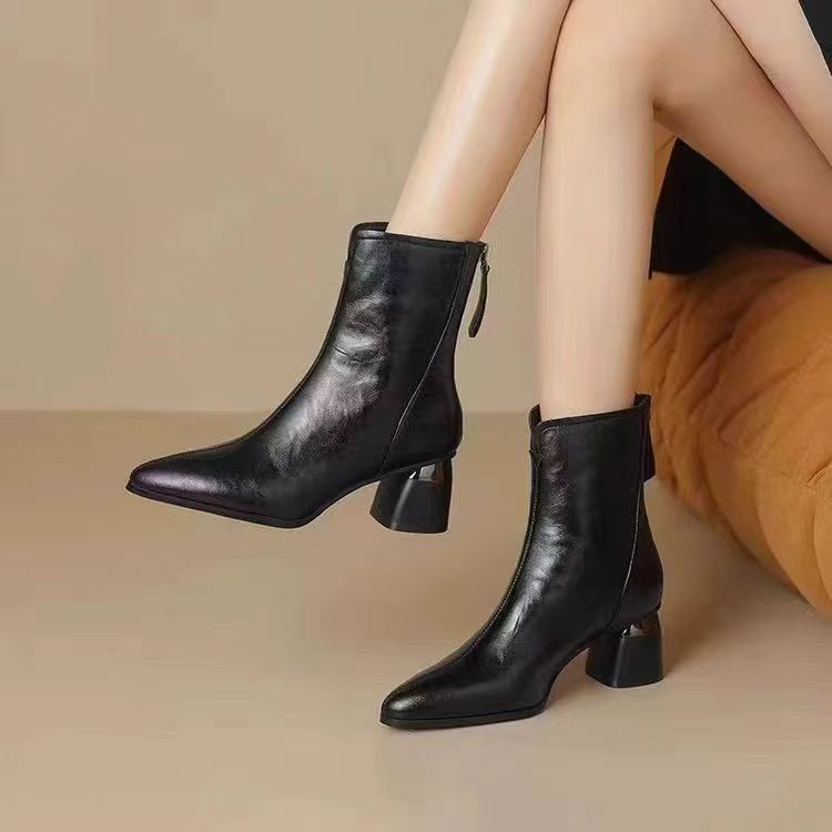 작은 짧은 부츠 여성의 2024 새로운 가을과 겨울 하이힐 여성 신발 기모 뾰족한 두꺼운 힐 가죽 신발 부드러운 가죽 마틴 부츠스토어 가기
