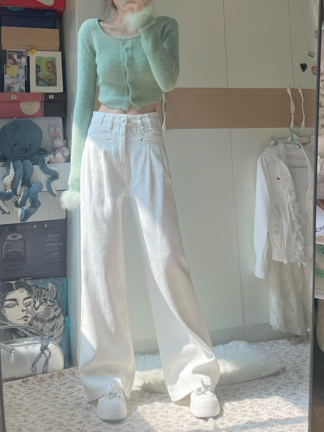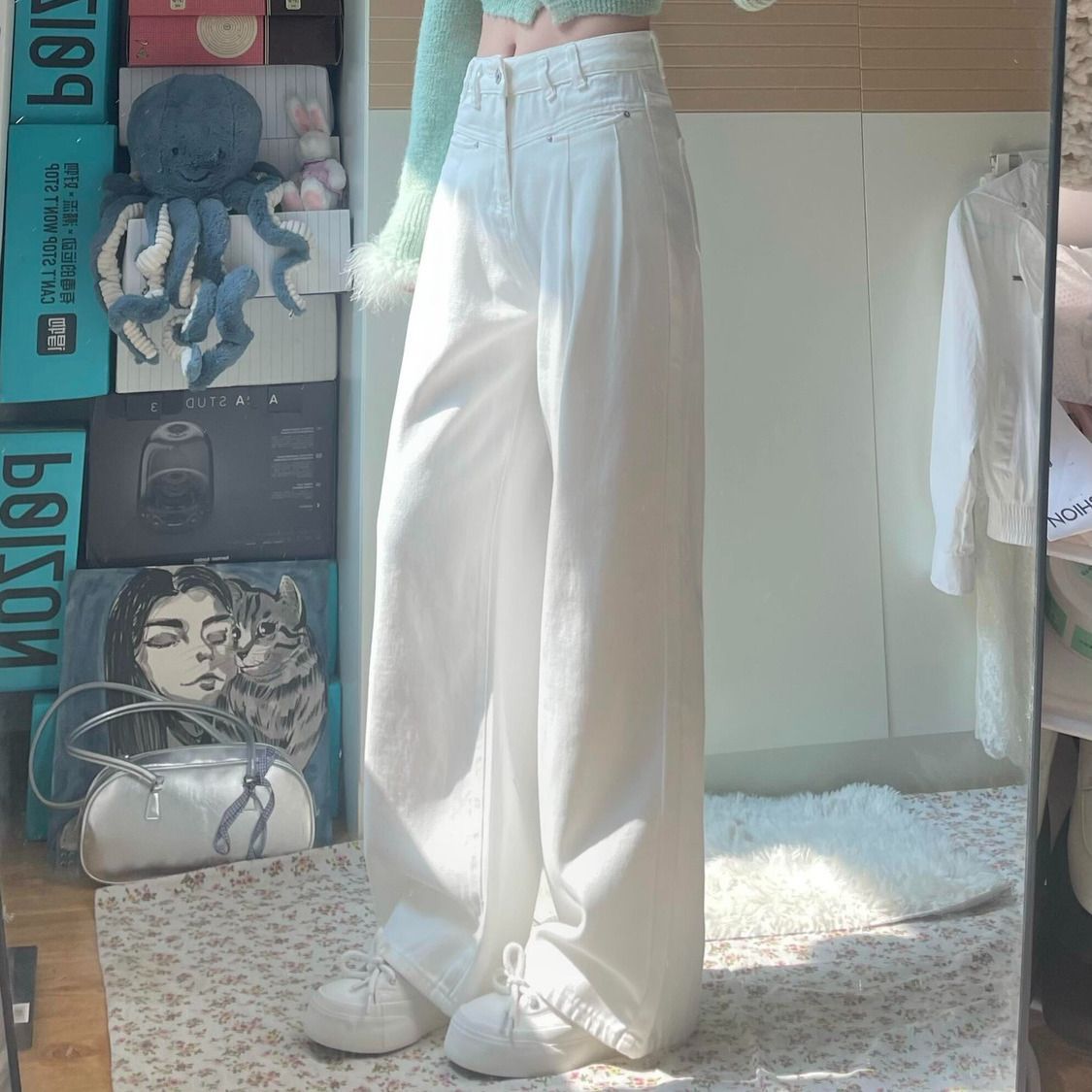 흰색 신선한 스타일 디자인 넓은 다리 청바지 여성의 가을 높은 허리 느슨한 주름 직선 바지스토어 가기