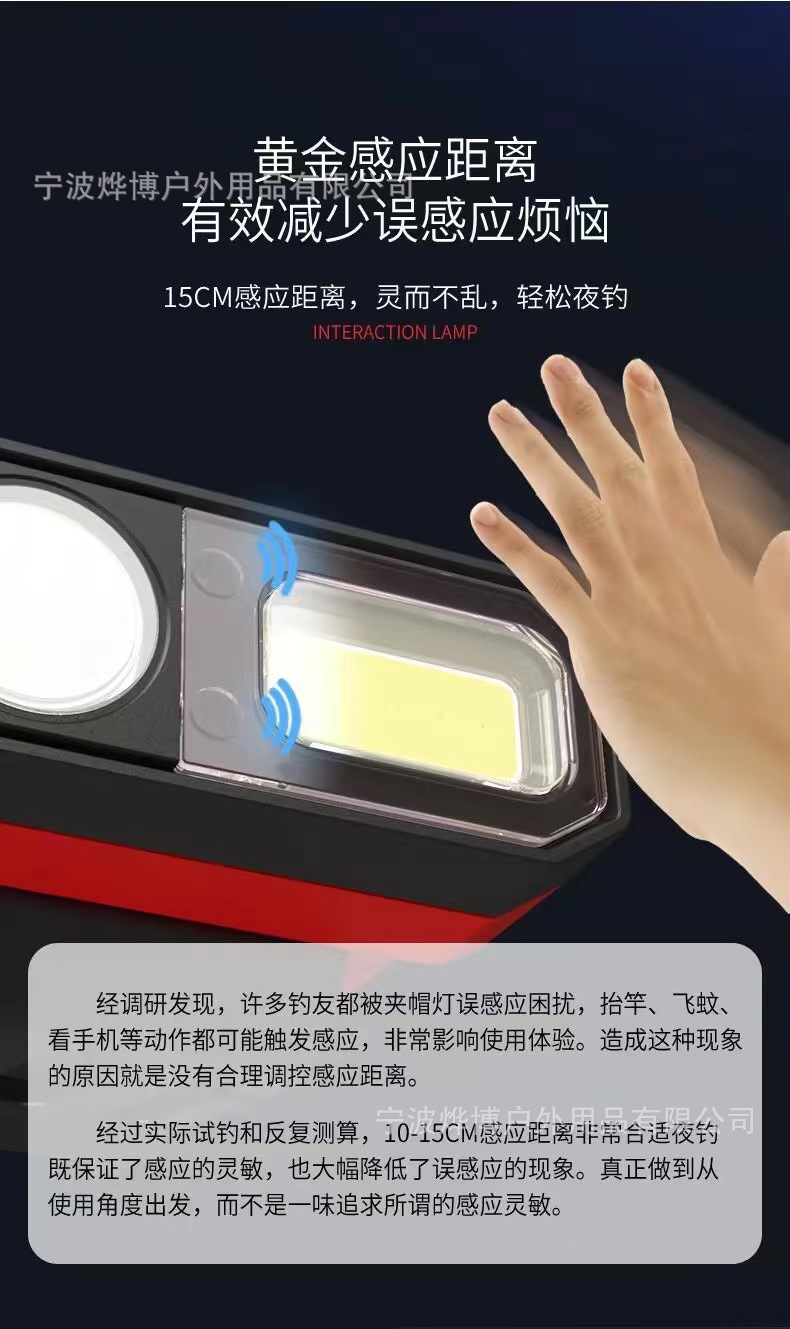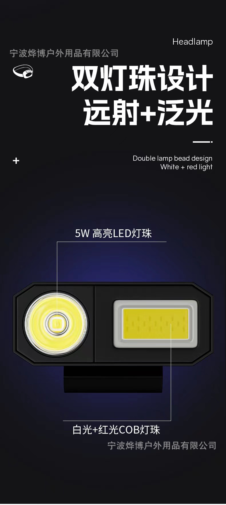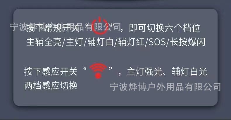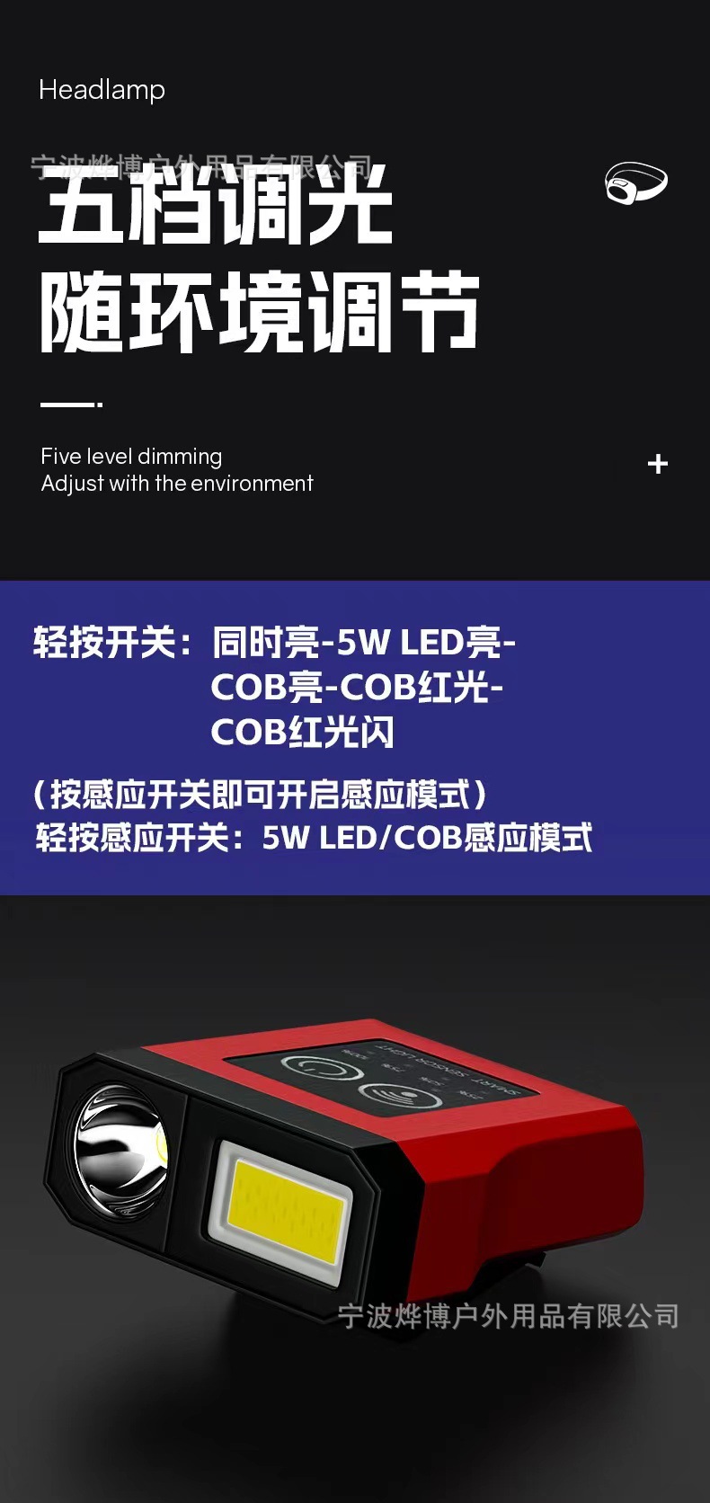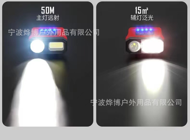 【档位介绍】:强光(双灯亮)-中光(LED亮)-中光(COB亮)-COB红光-COB红闪-LED和COB双闪-感应模式