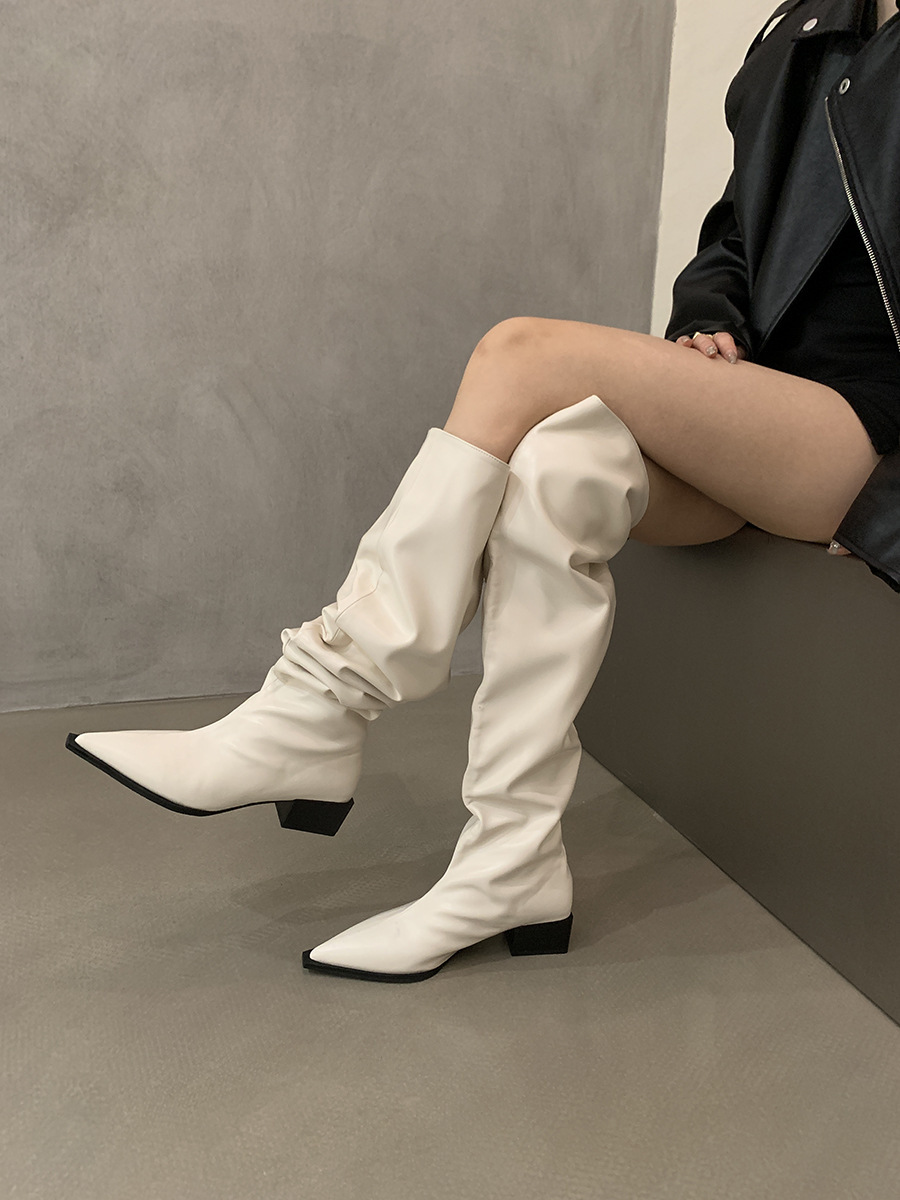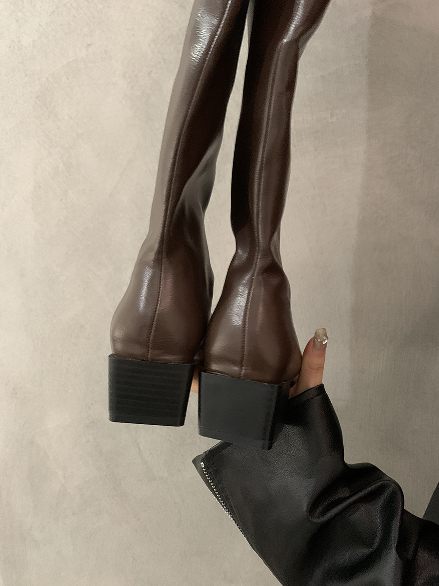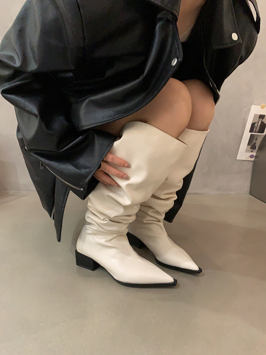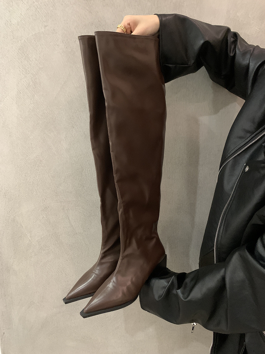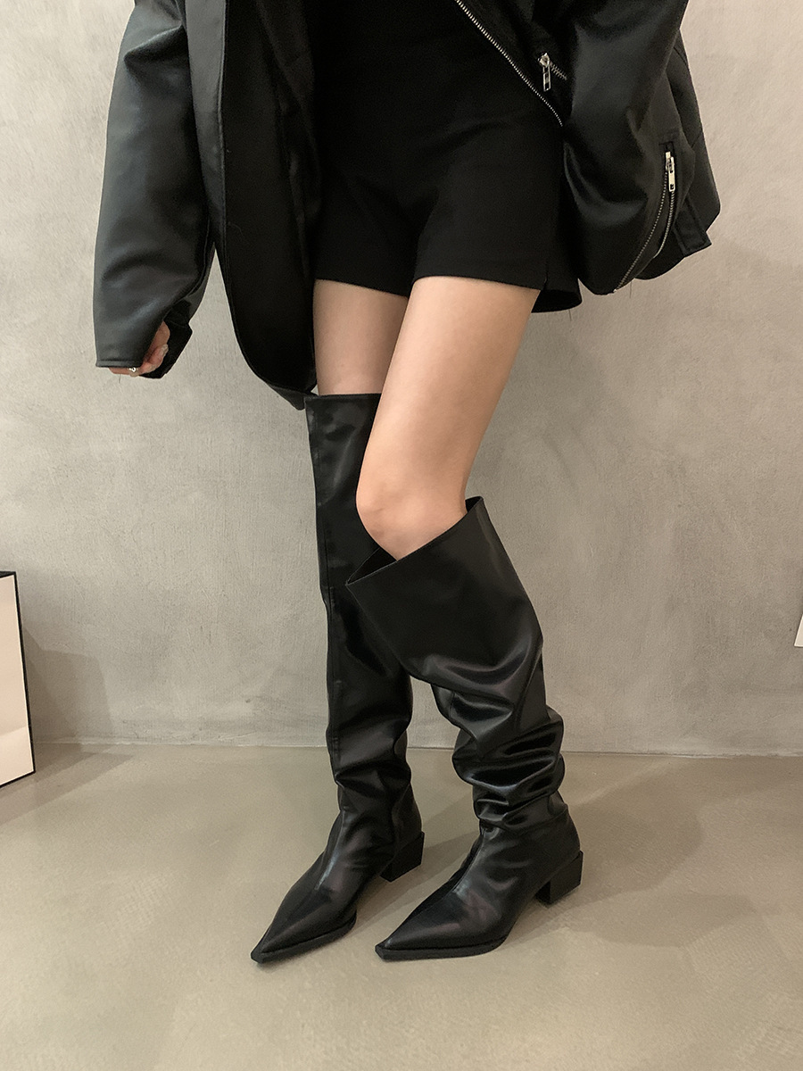 두꺼운 굽의 검정색 무릎 위까지 오는 롱부츠 여성용 신발 2025년 신상 가을 겨울 뾰족코 슬림 스타일 라이더 부츠스토어 가기