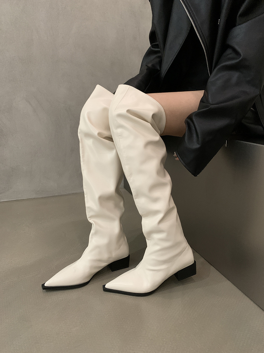 두꺼운 굽의 검정색 무릎 위까지 오는 롱부츠 여성용 신발 2025년 신상 가을 겨울 뾰족코 슬림 스타일 라이더 부츠