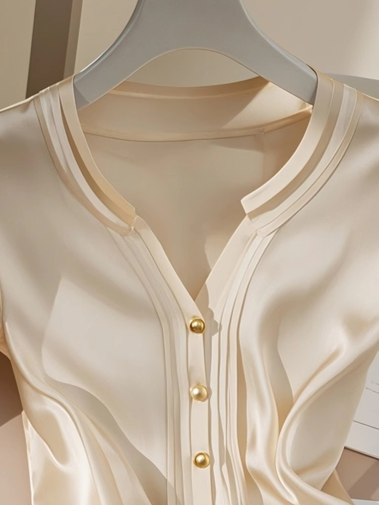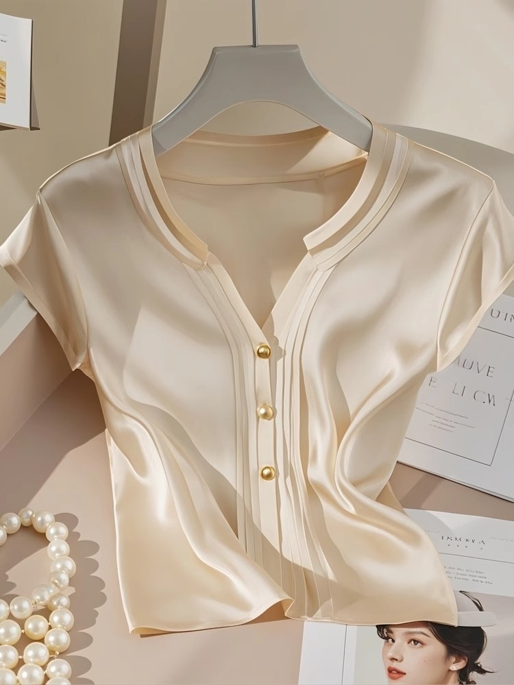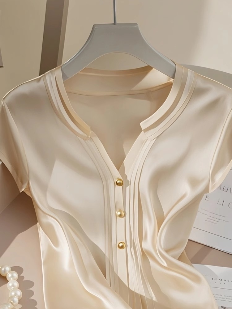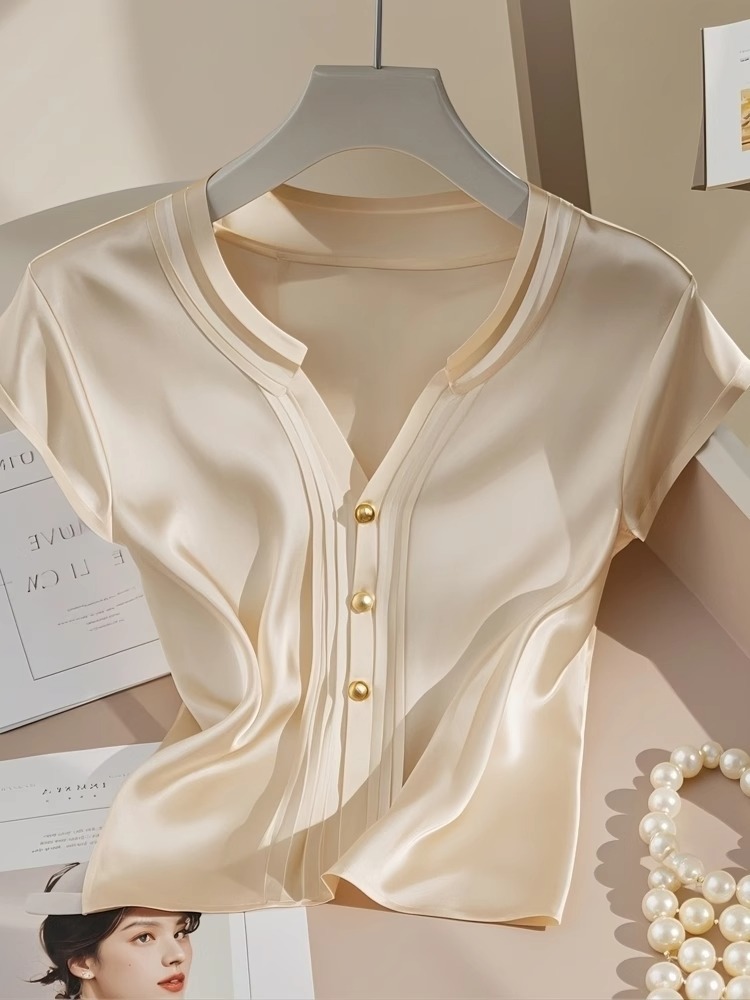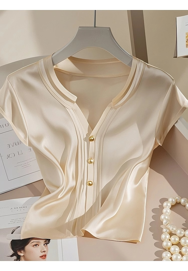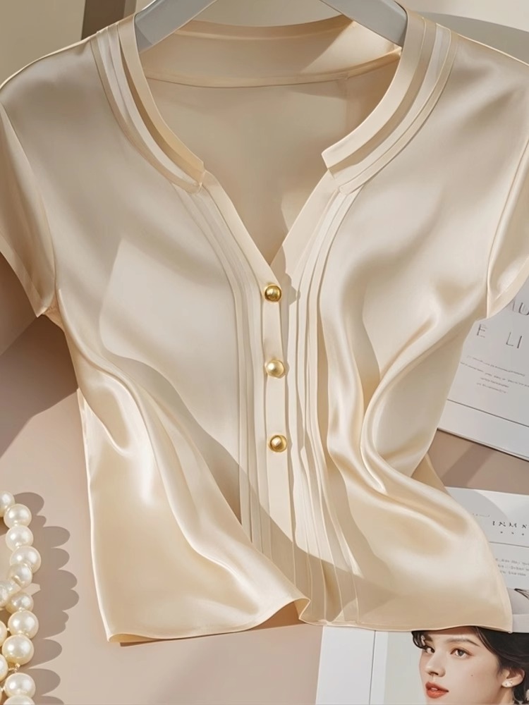 예쁜 작은 셔츠 프랑스 우아한 Acetic Satin 최고 고급 센스 샴페인 컬러 반팔 셔츠 여성 여름 4269