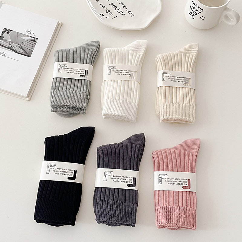 가을과 겨울 더블 바늘 두꺼운 라인 양말 여성 일본식 Ins 쌓인 양말 모든 경기 슬리밍 수직 스트립 두꺼운 솔리드 컬러 미드 튜브 양말스토어 가기