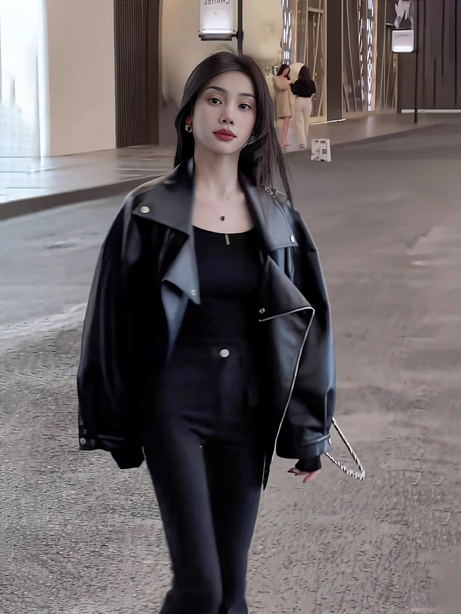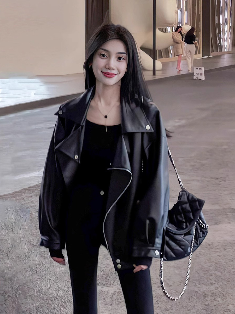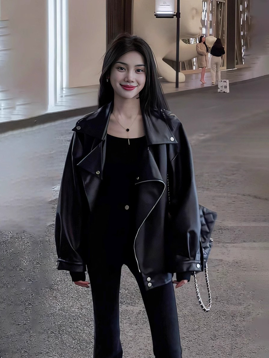검은 가죽 자켓 여성 2024 새 봄 가을 자전거 세트 작은 플러스 사이즈 한국 캐주얼 느슨한 재킷스토어 가기