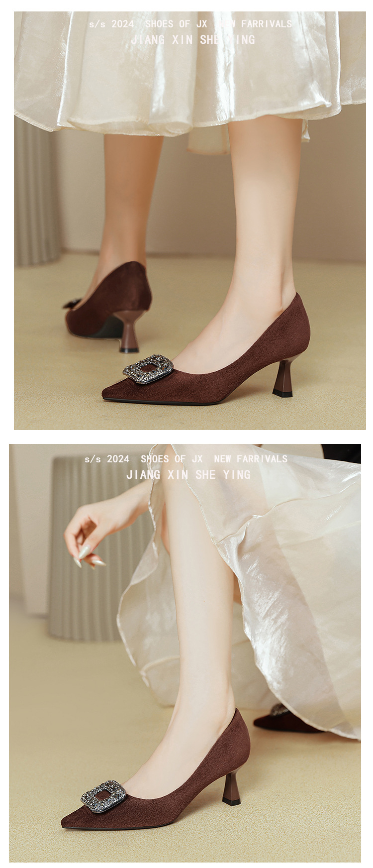 지적 발가락 라인 석 스퀘어 버클 하이힐 여성 스틸레토 힐 2025 새로운 봄, 가을 피곤하지 않은 블랙 스웨이드 프랑스 신발스토어 가기