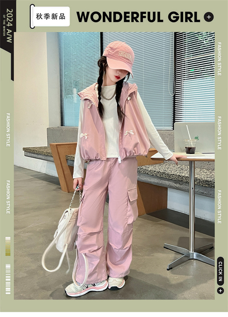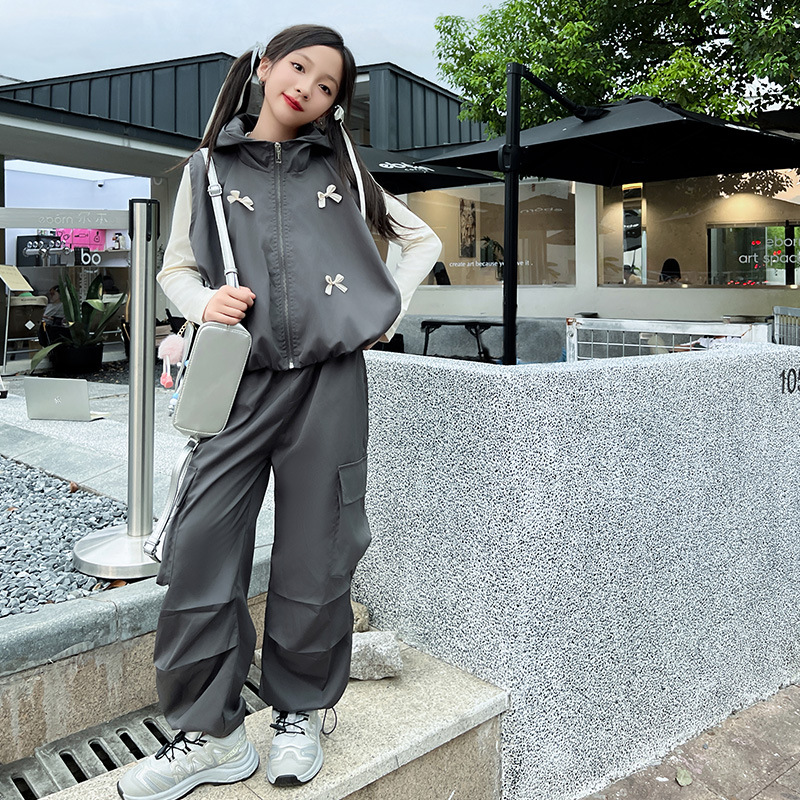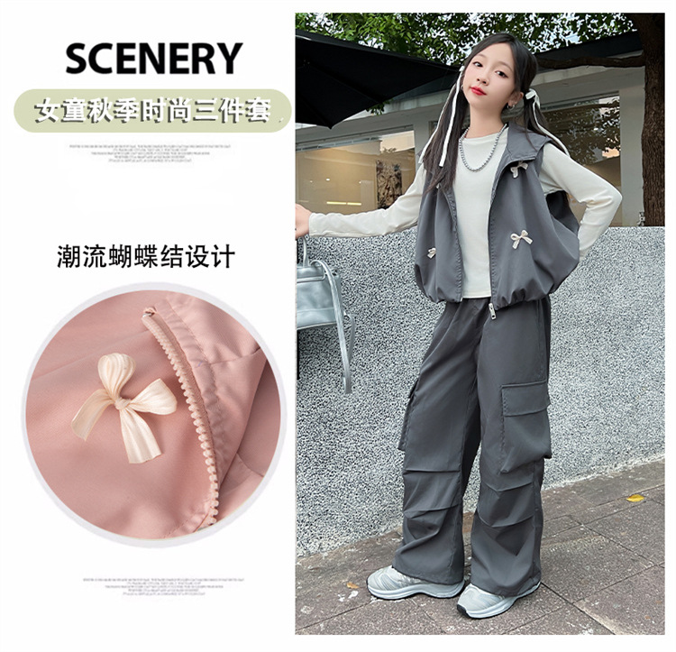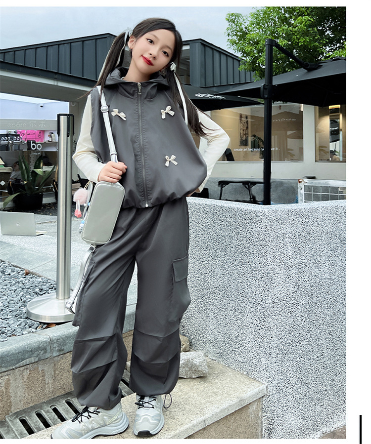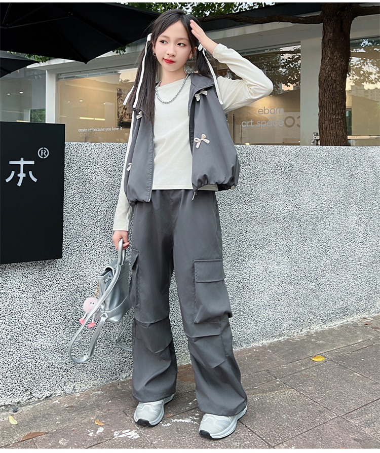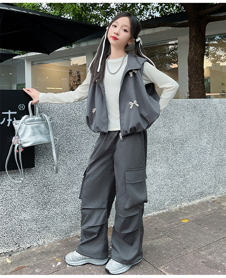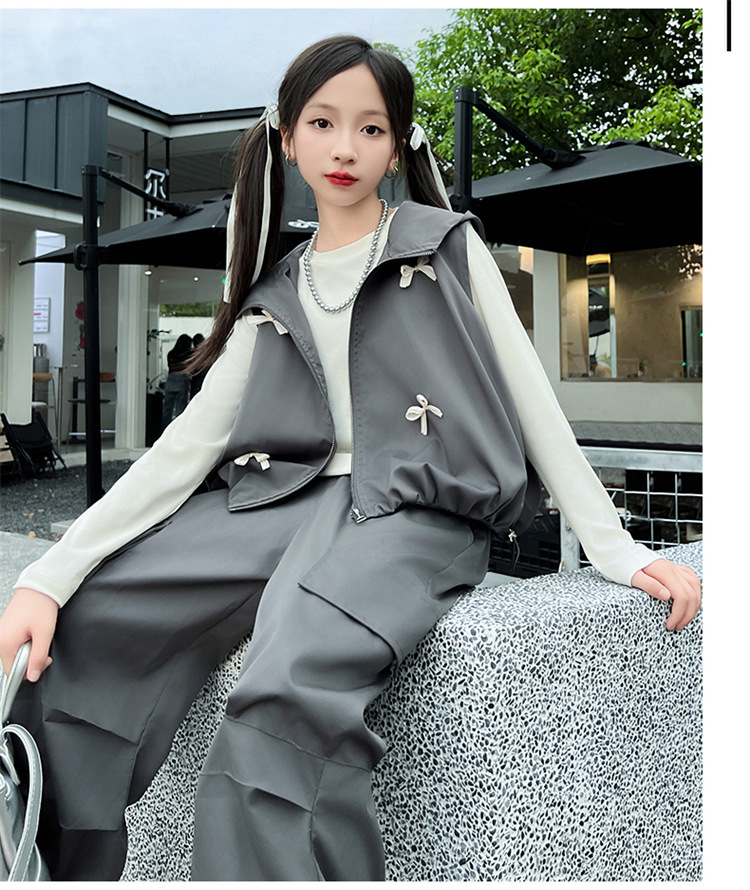 소녀 후드 양복 조끼 바지 3 종 세트 봄과 가을 2024 새로운 중대형 어린이 패션 멋진 외국 스타일 세트 패션스토어 가기