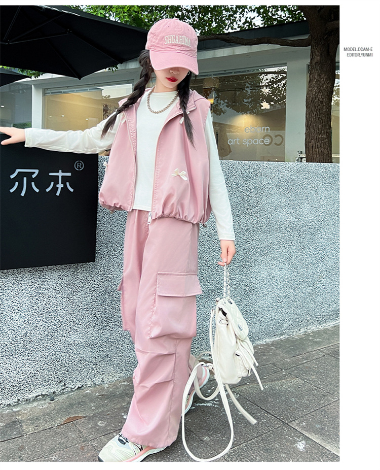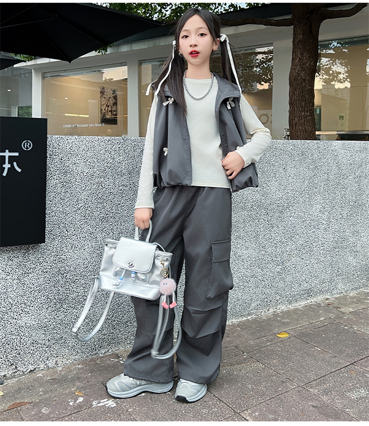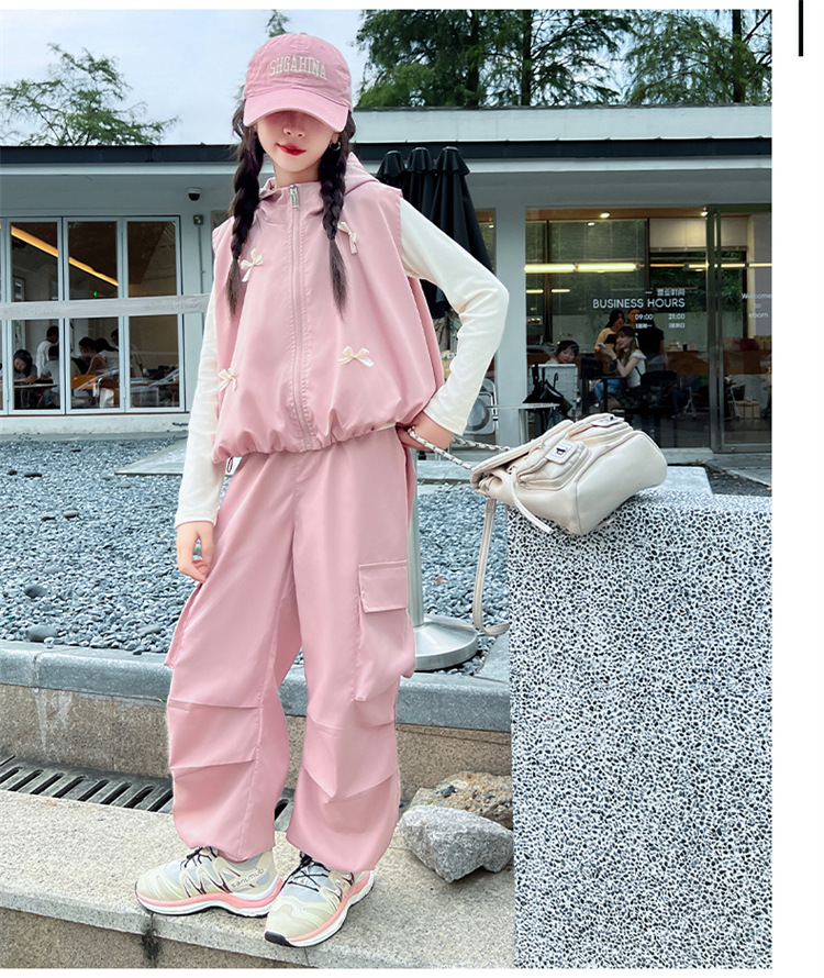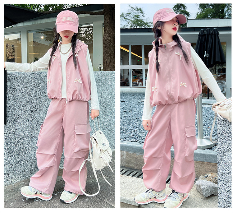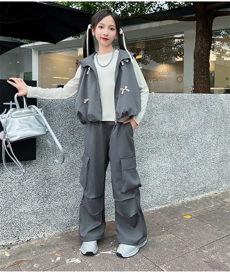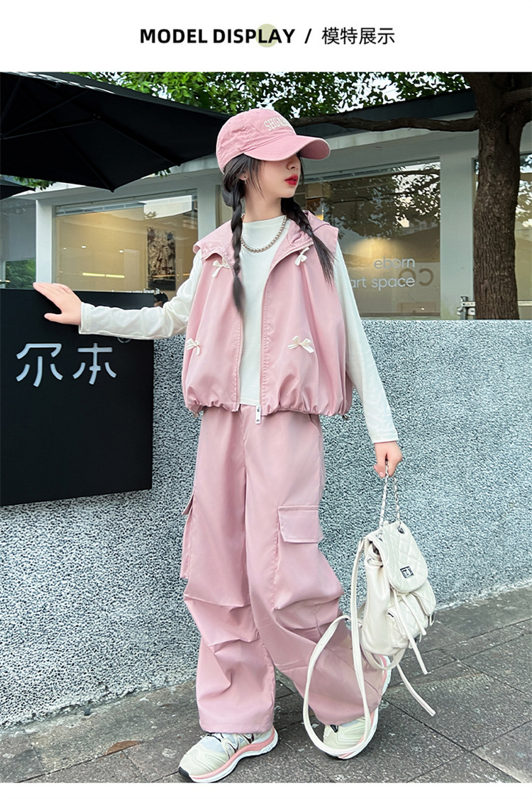 소녀 후드 양복 조끼 바지 3 종 세트 봄과 가을 2024 새로운 중대형 어린이 패션 멋진 외국 스타일 세트 패션스토어 가기