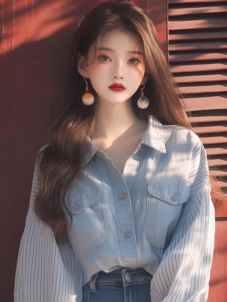 니치 패셔너블 서양식 디자인 탑 한국식 시대 감소 루즈 슬림핏 슈퍼 니스 블루 데님 바느질 셔츠