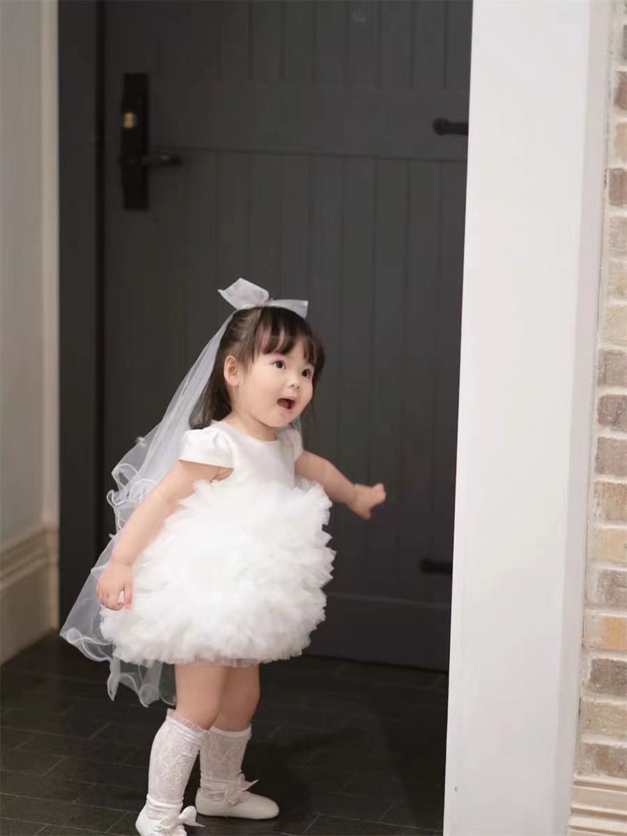 고급 흰색 소녀의 첫 번째 생일 꽃 소녀 결혼식 원피스 여성 보물 공주 투투 스커트는 사계절에 착용 할 수 있습니다스토어 가기