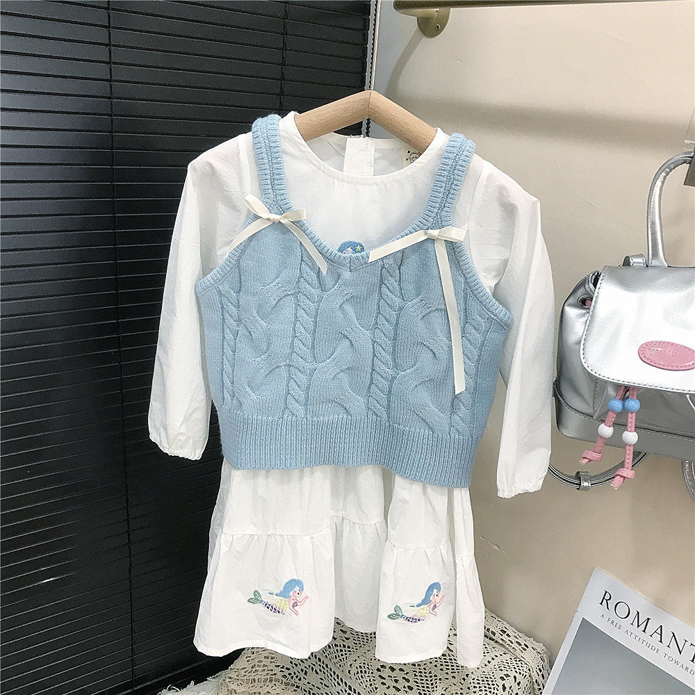 한국 아동복 소녀 봄과 가을 푸른 나비 울 조끼 여성 인어 자수 원피스 대외 무역