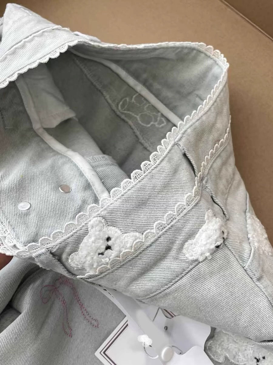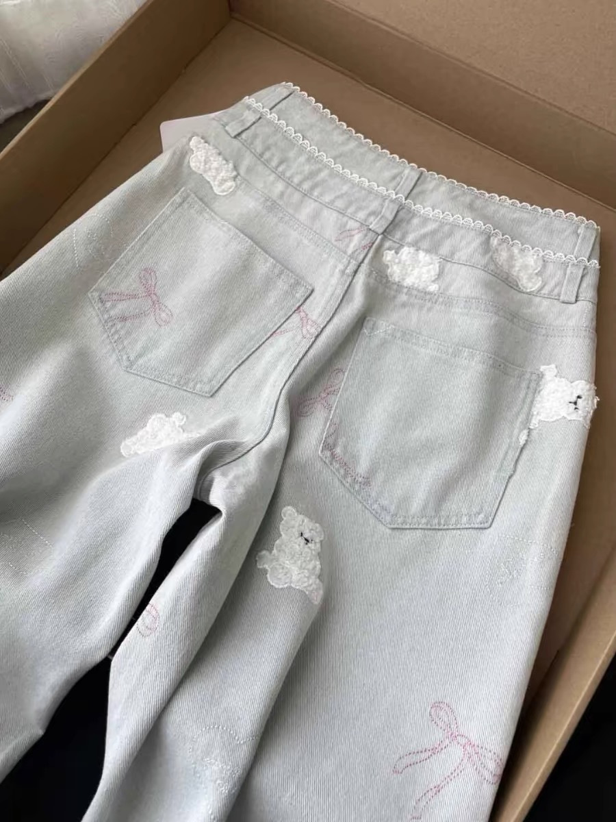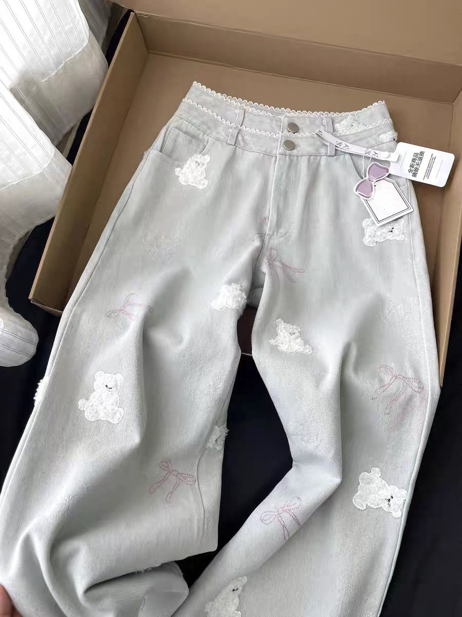 레이스 더블 허리 버튼 귀여운 곰 자수 직선 청바지 여성 달콤한 소녀 작은 느슨한 슬리밍 바지