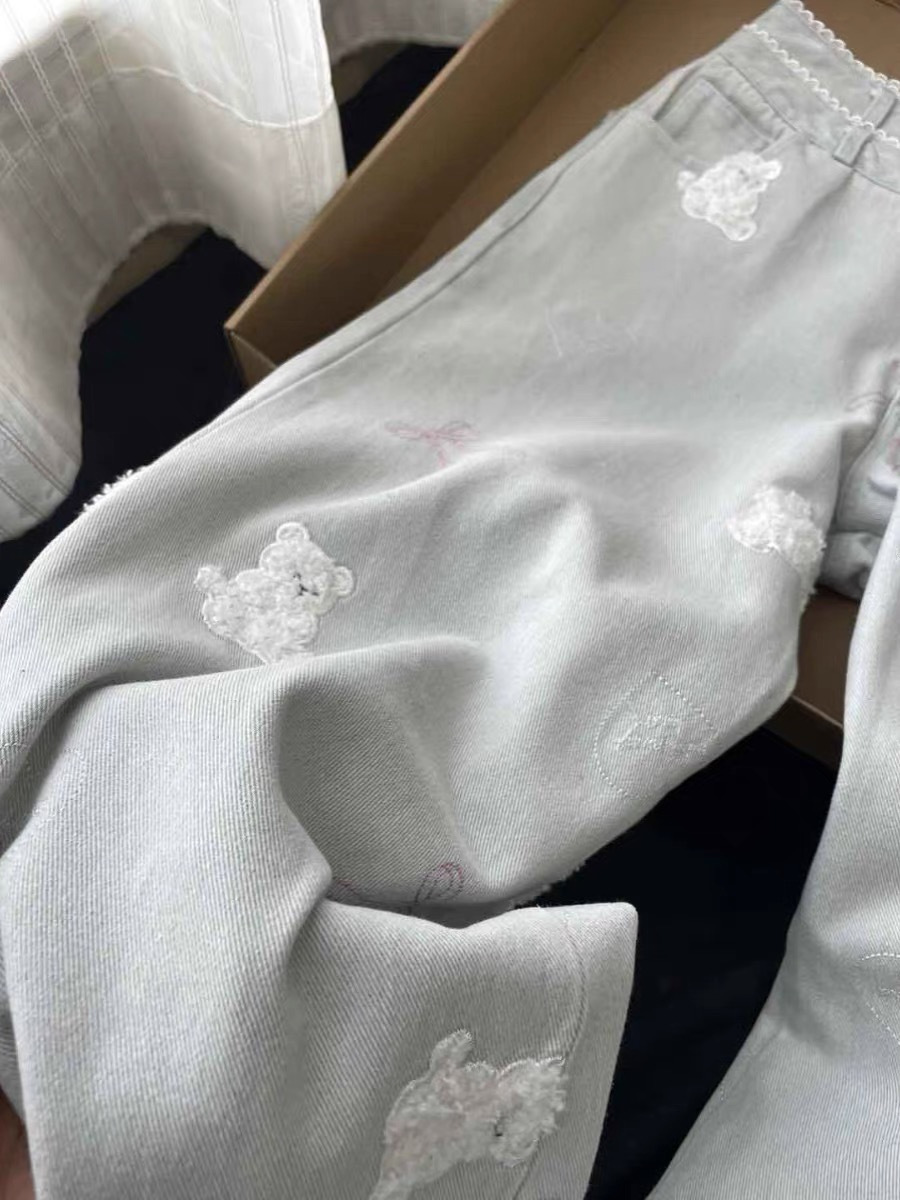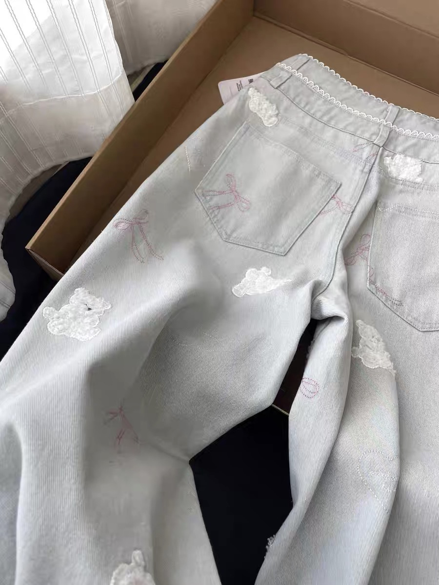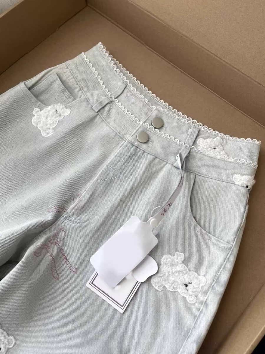 레이스 더블 허리 버튼 귀여운 곰 자수 직선 청바지 여성 달콤한 소녀 작은 느슨한 슬리밍 바지스토어 가기