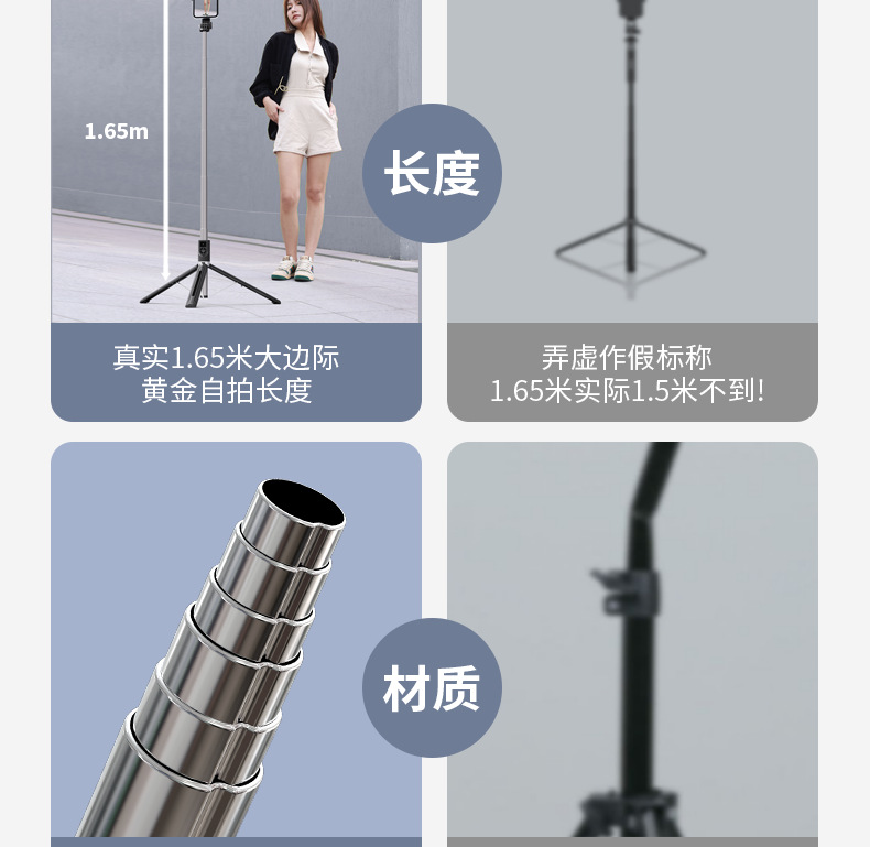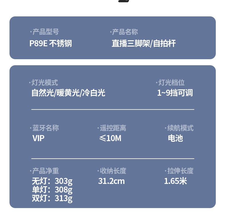 • P89E-V2/ 1.65m 스테인레스 스틸 휴대폰 셀카봉/이중 조명