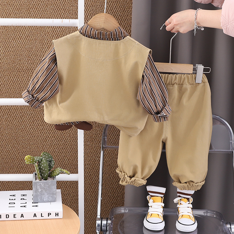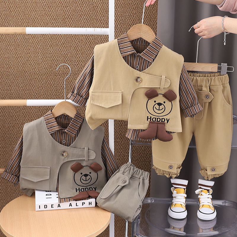 봄 2025 새로운 소년 작업복 조끼 셔츠 긴 소매 3 조각 세트 남성 아기 캐주얼 바지 세트 머리스토어 가기