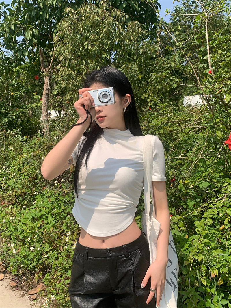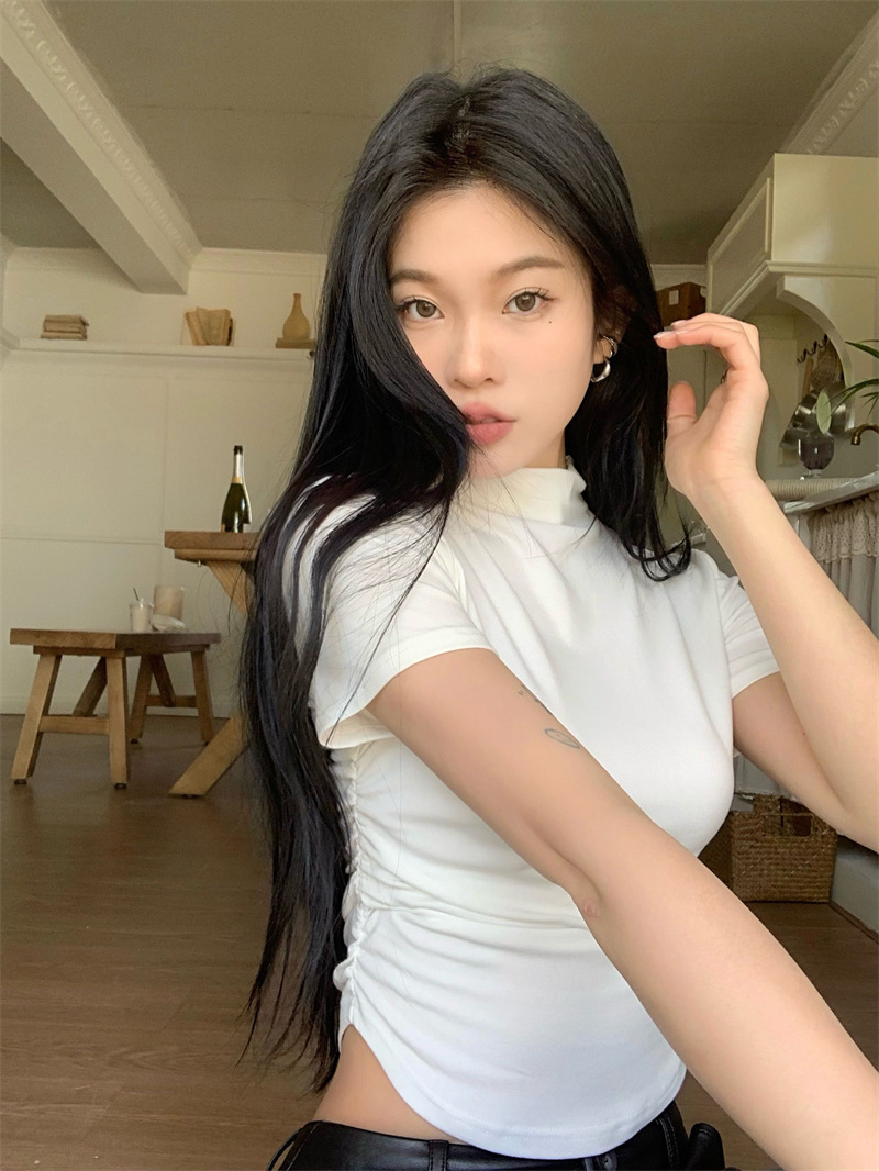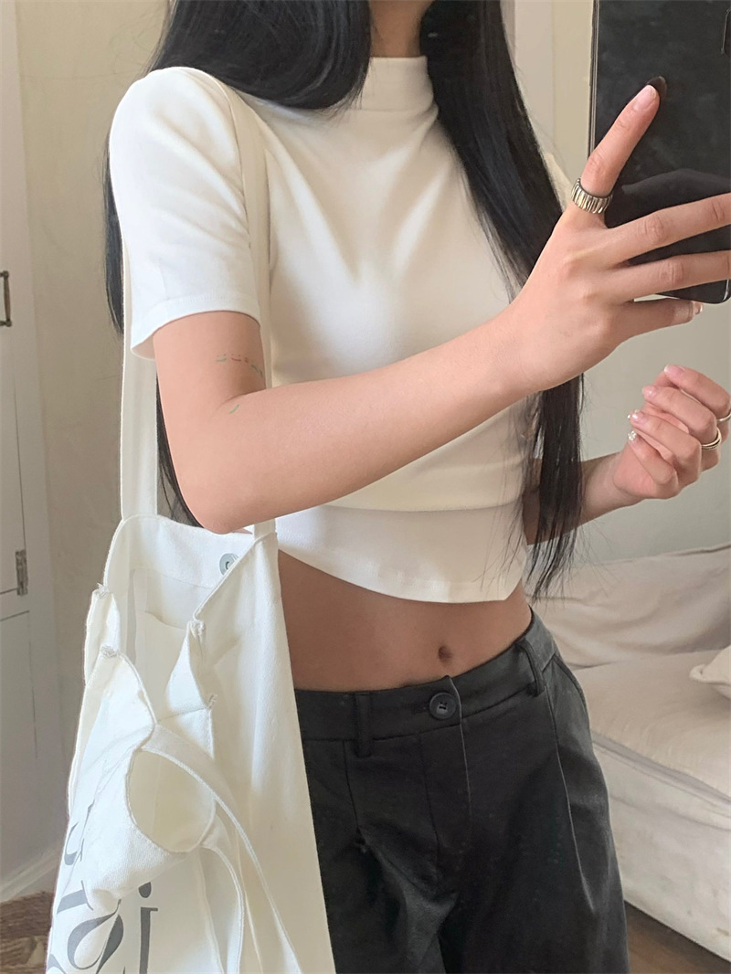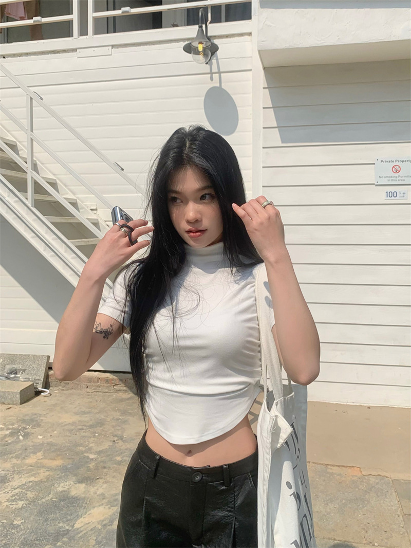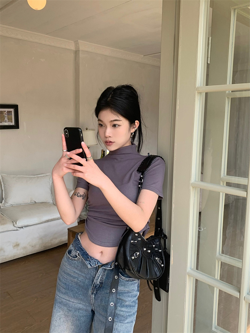 짧은 슬림핏 하프 하이 칼라 내베이스 셔츠 여성용 여름 2024 핫 걸 디자인 센스 슬림 핏 반팔 티셔츠 탑