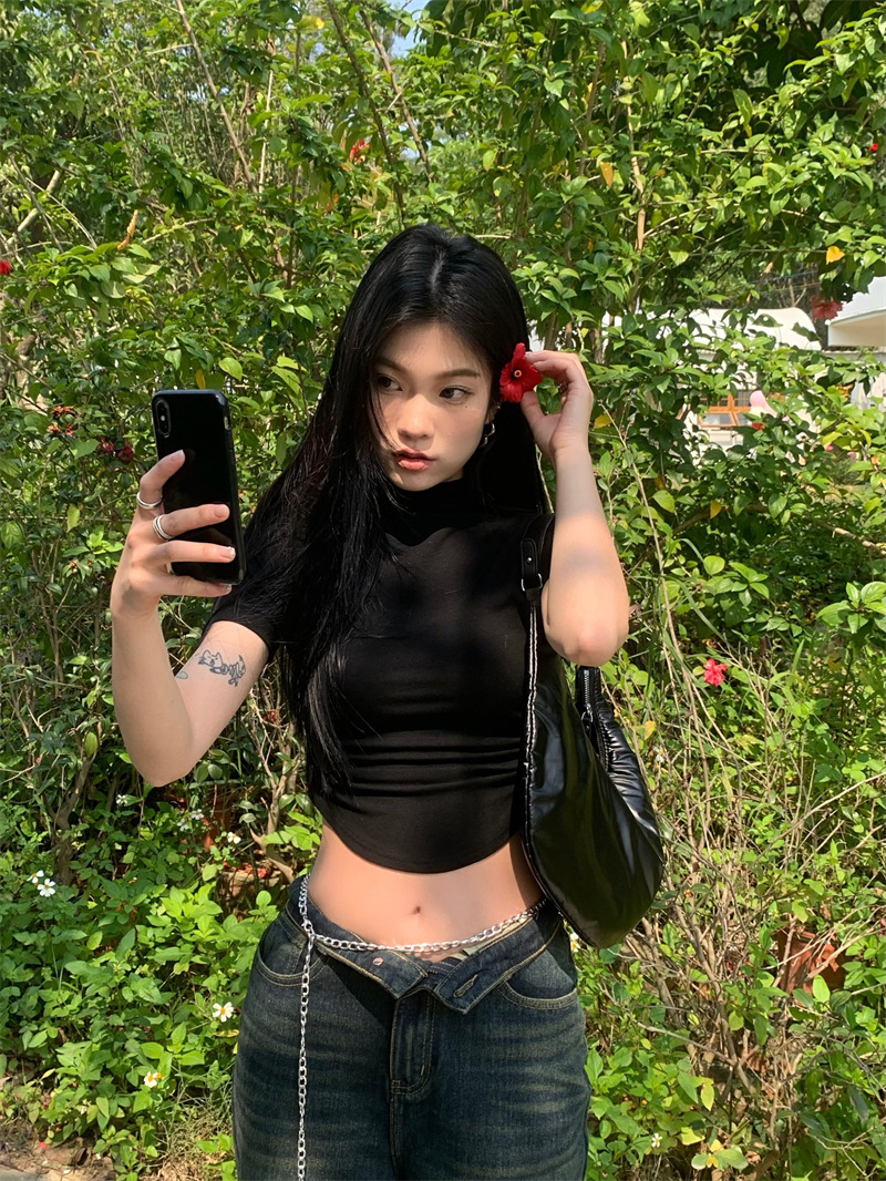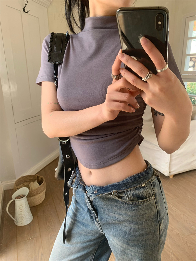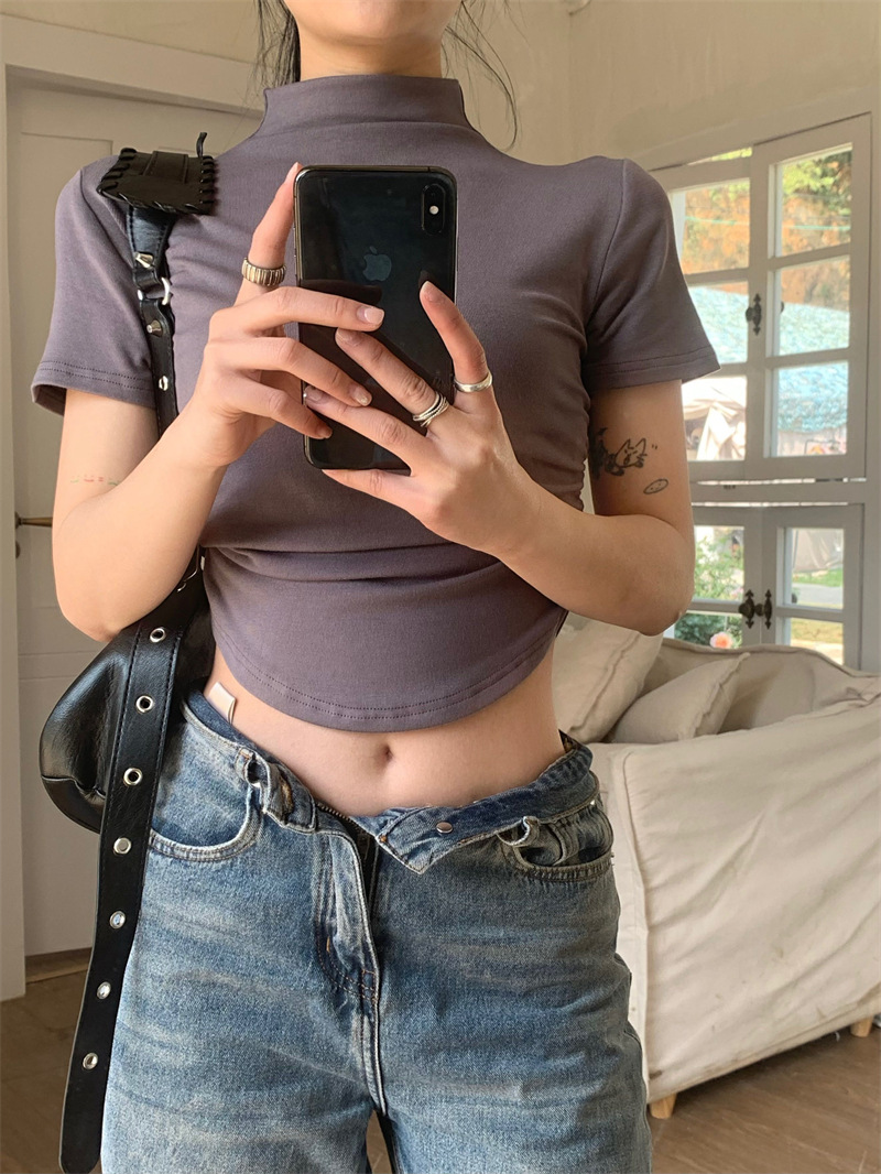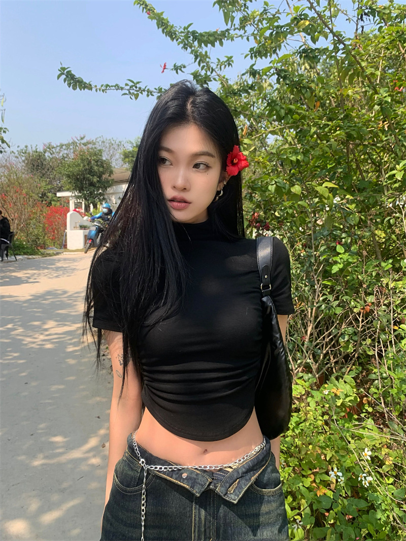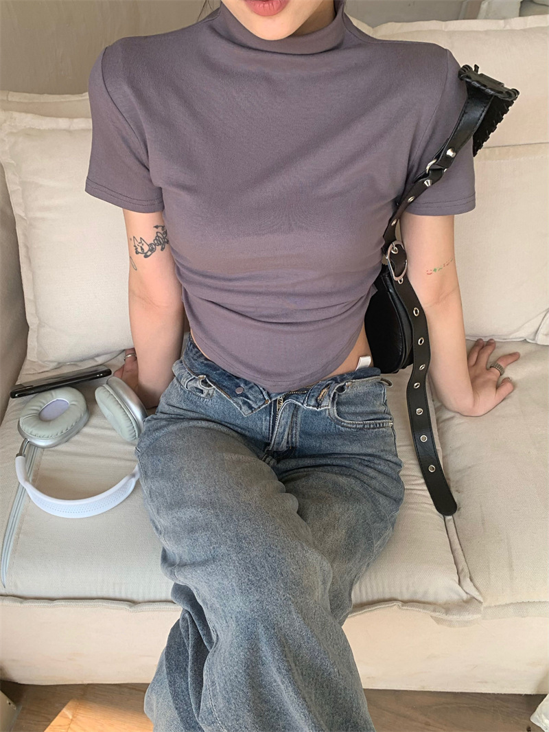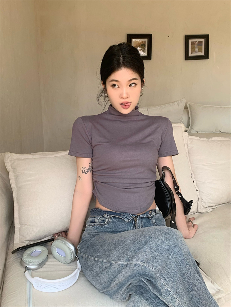 짧은 슬림핏 하프 하이 칼라 내베이스 셔츠 여성용 여름 2024 핫 걸 디자인 센스 슬림 핏 반팔 티셔츠 탑