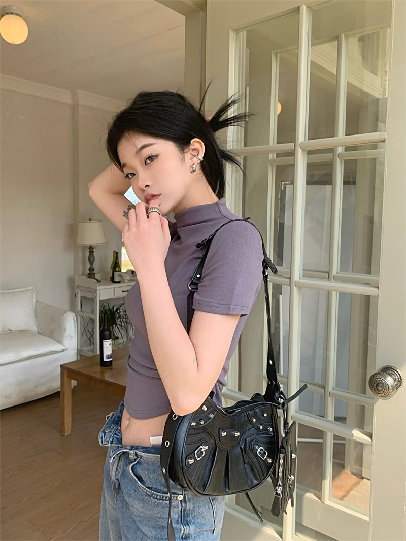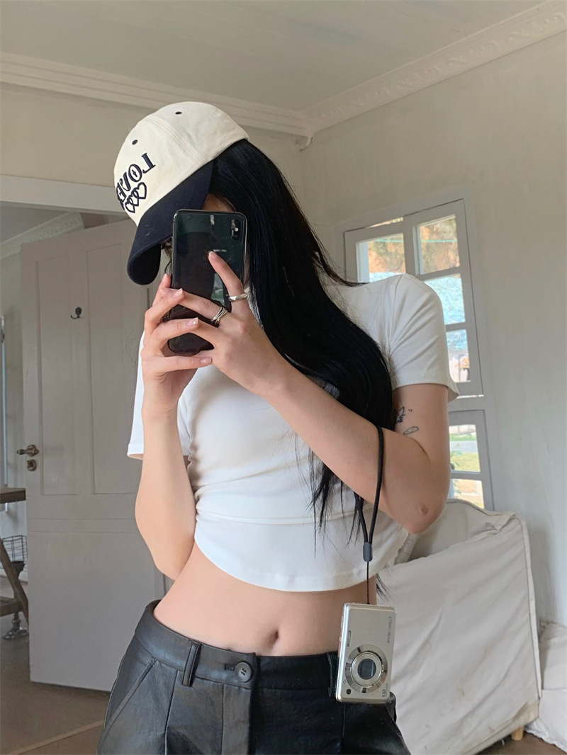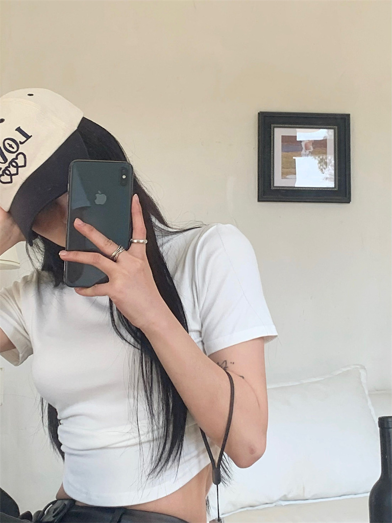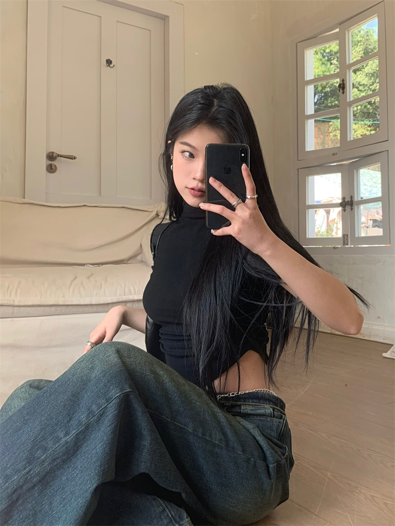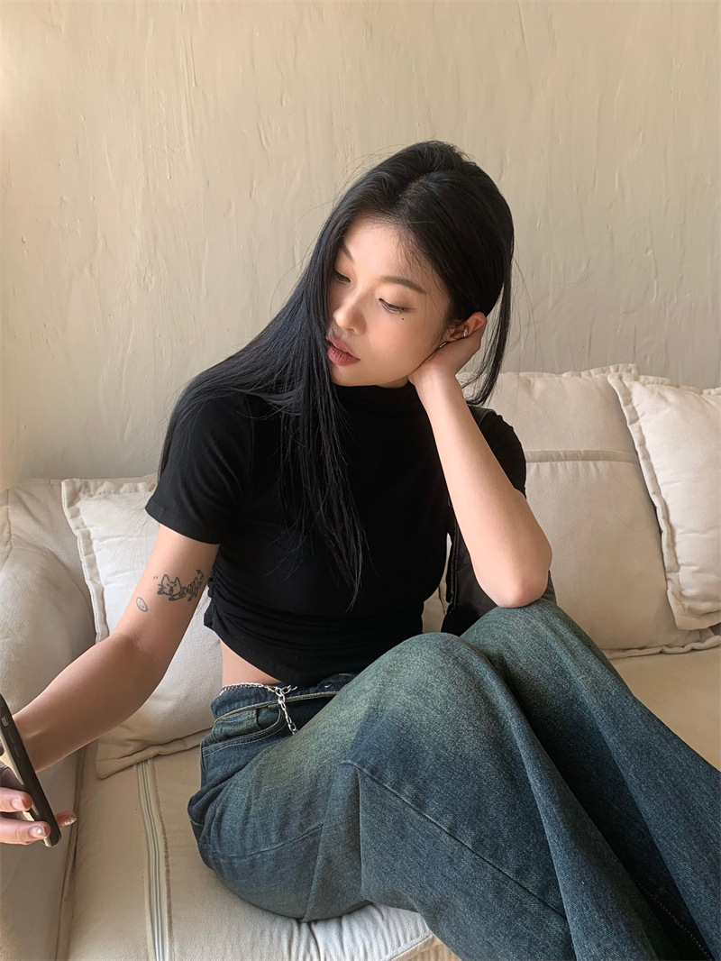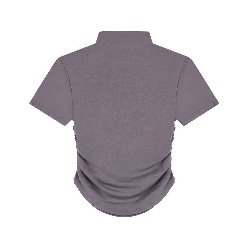 짧은 슬림핏 하프 하이 칼라 내베이스 셔츠 여성용 여름 2024 핫 걸 디자인 센스 슬림 핏 반팔 티셔츠 탑