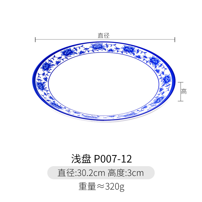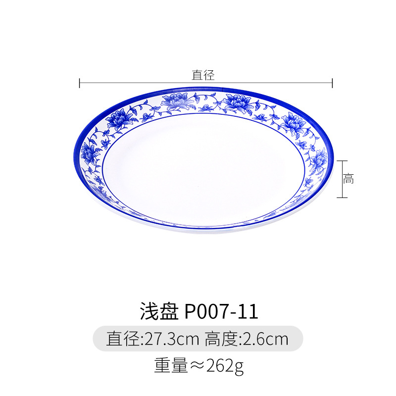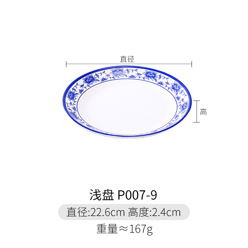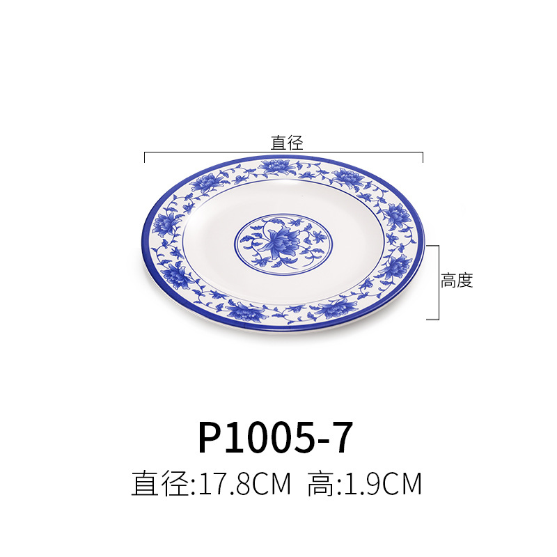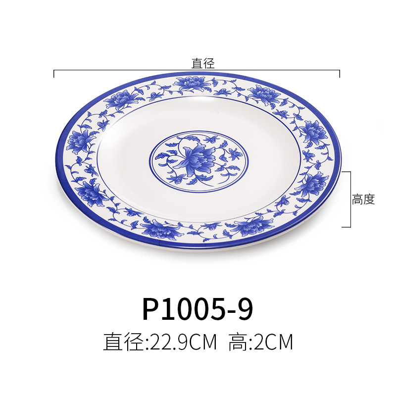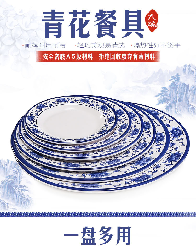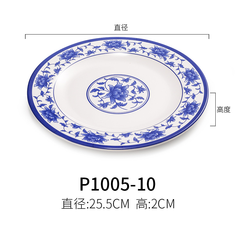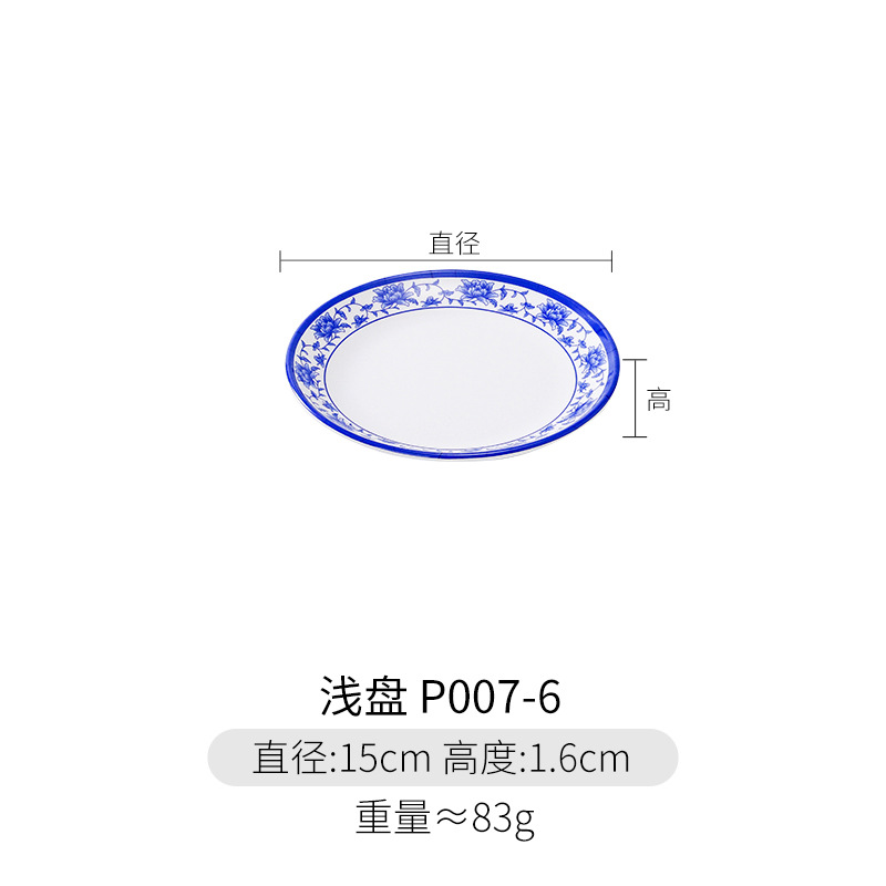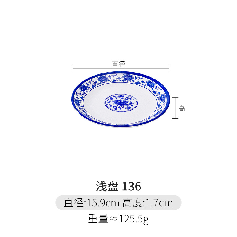 파란색과 흰색 상업용 A5 멜라민 플레이트 플라스틱 둥근 평판 도자기 레스토랑 볶음 접시 레스토랑 접시 간식 접시스토어 가기