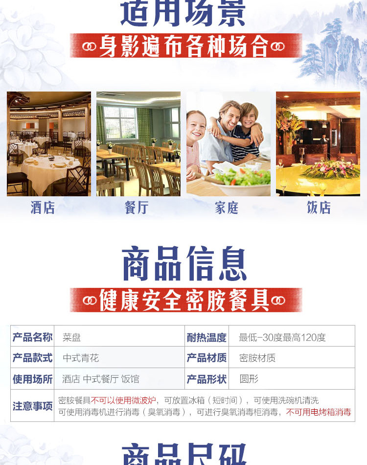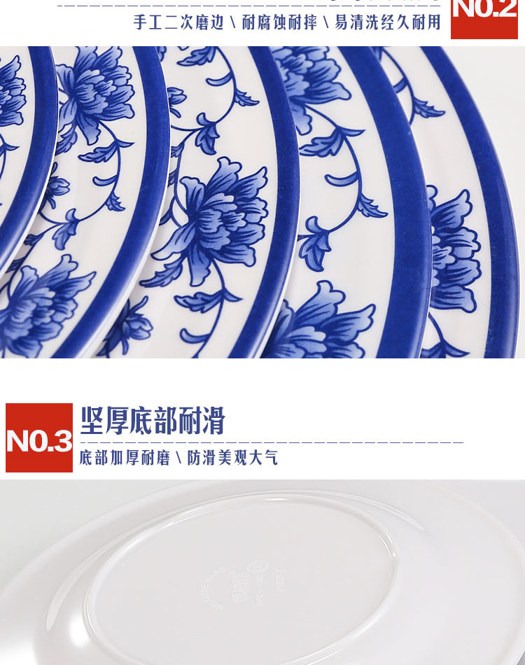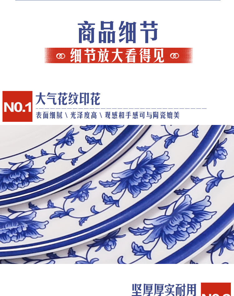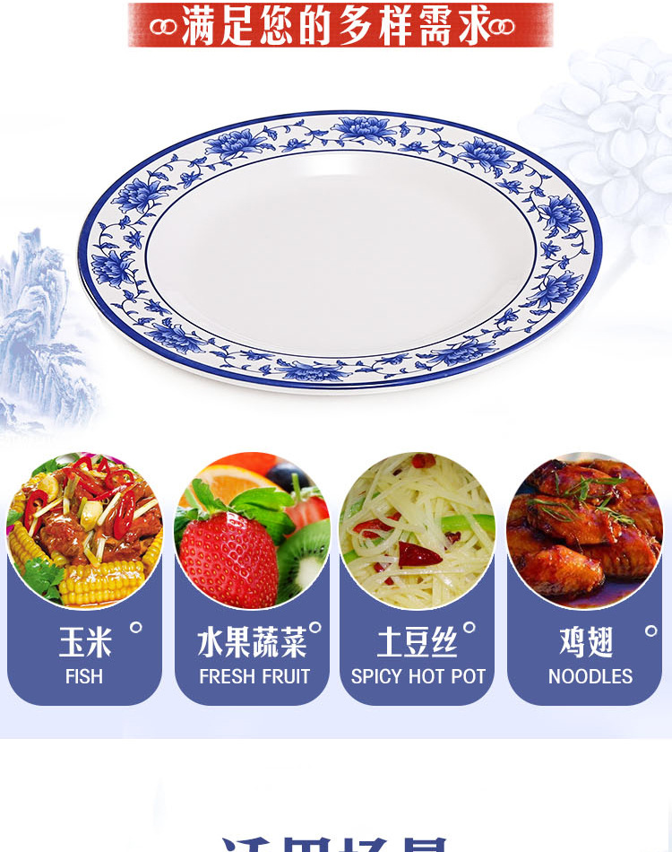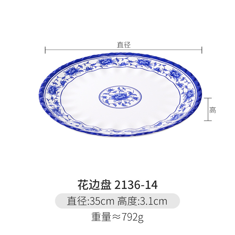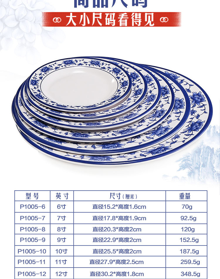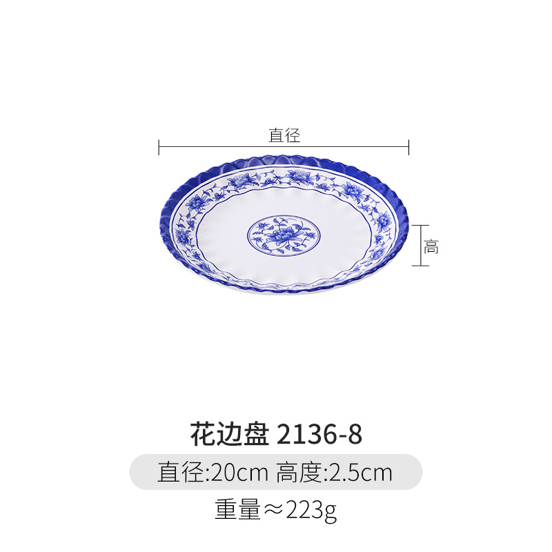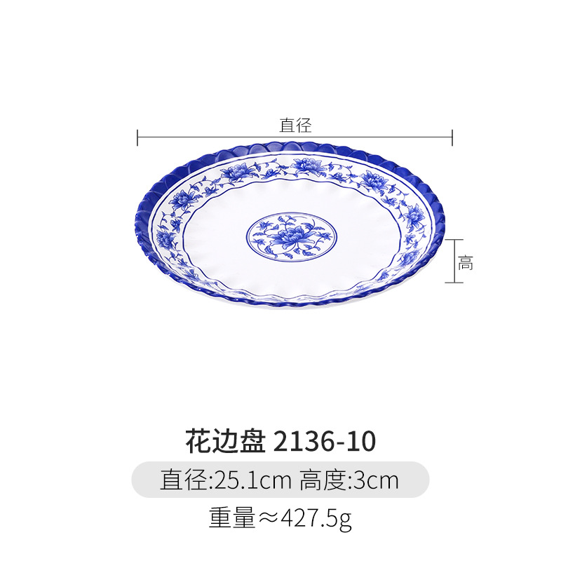 파란색과 흰색 상업용 A5 멜라민 플레이트 플라스틱 둥근 평판 도자기 레스토랑 볶음 접시 레스토랑 접시 간식 접시스토어 가기