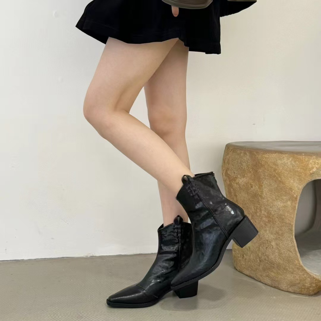 빈티지 포인팅 두꺼운 힐 부츠 여성의 2024 가을 및 겨울 새로운 프랑스 작은 발목 부츠 웨스턴 데님 V-입 마틴 부츠
