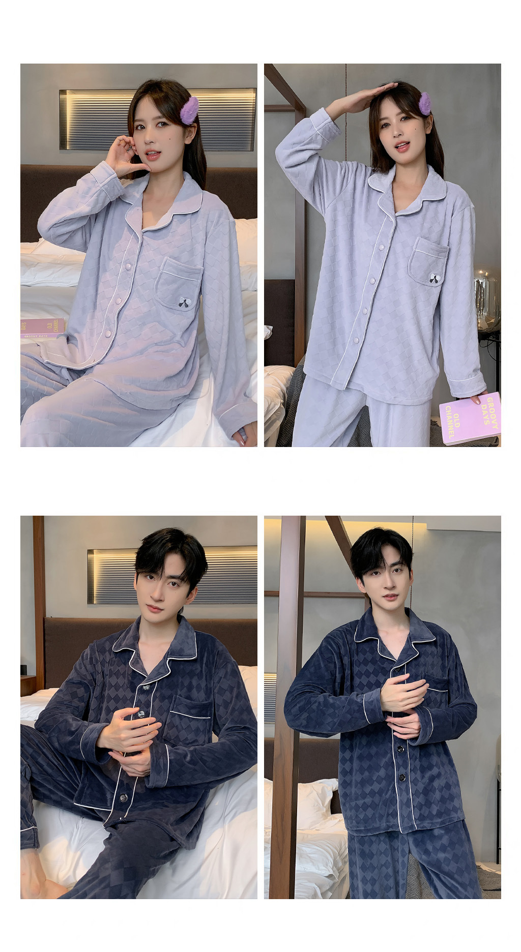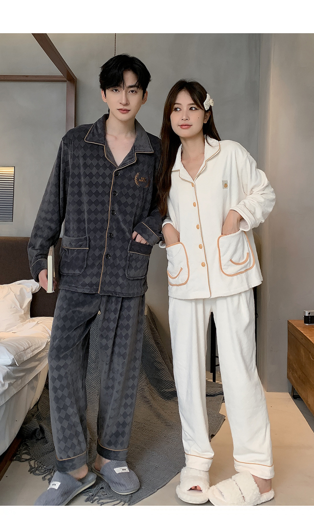 가을과 겨울 커플 잠옷 여성의 새로운 기모 섬 벨벳 따뜻한 집 옷 세트 달콤한 겉옷 남성용