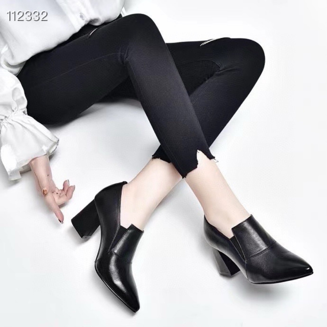 뾰족한 깊은 입 싱글 레이어 신발 2024 봄 새로운 간단한 우아한 슬리밍 두꺼운 힐 암소 가죽 슬립 온 작업 신발스토어 가기