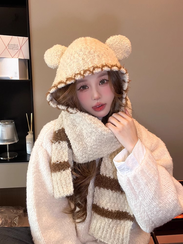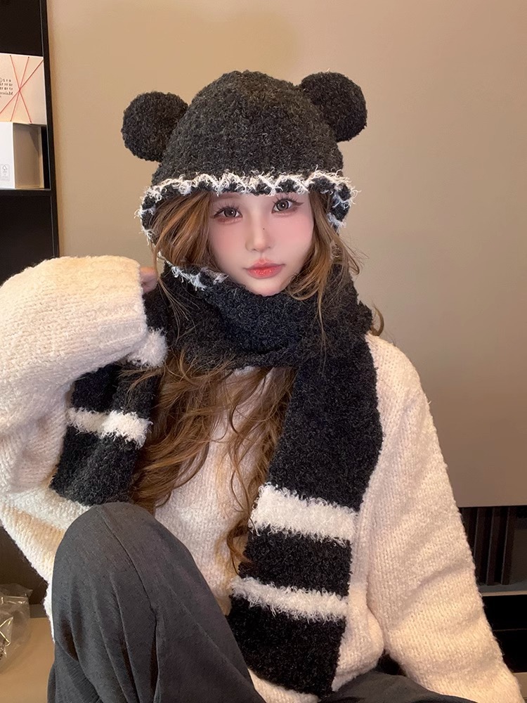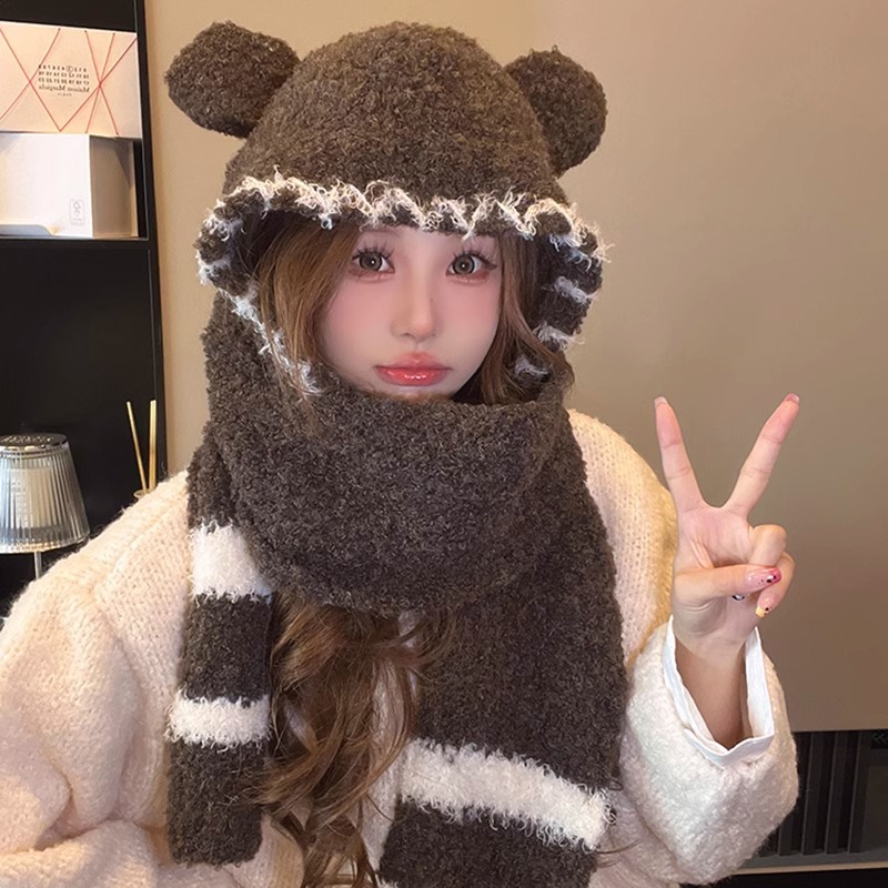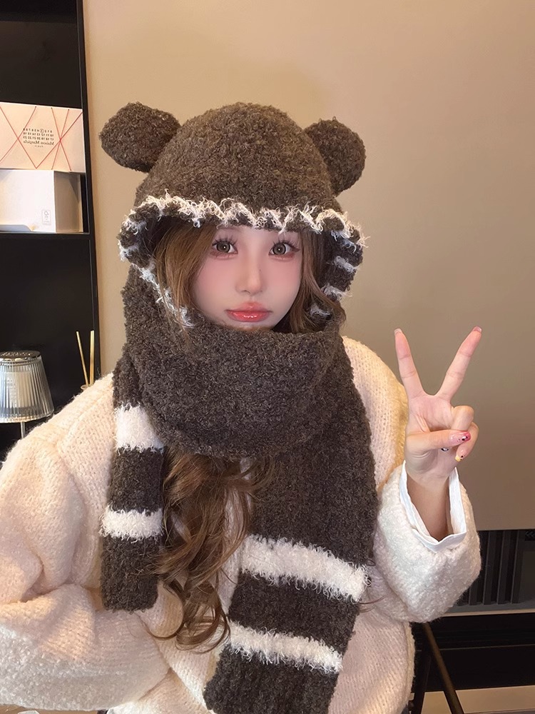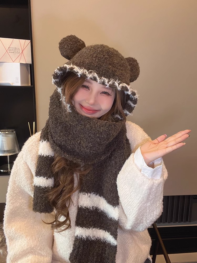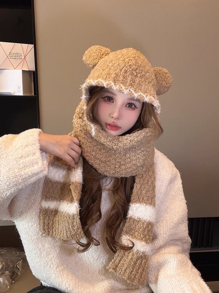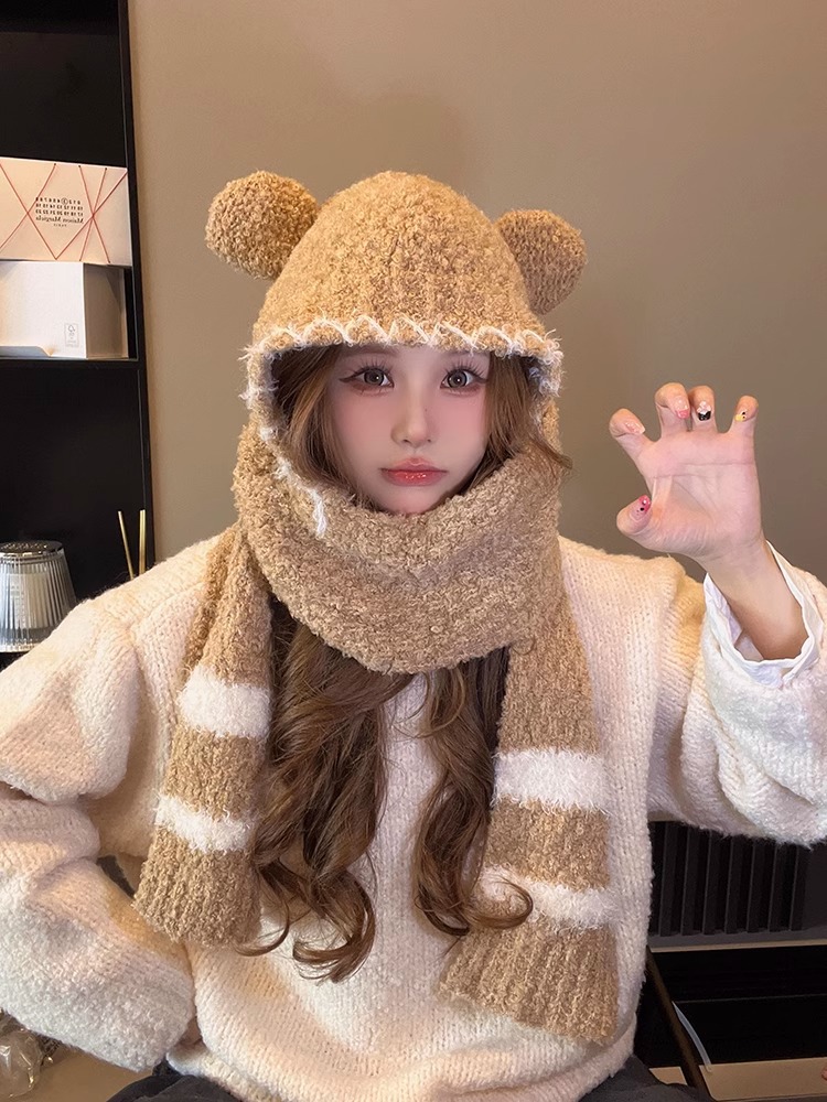 2024 새로운 곰 귀 모자 스카프 여성의 겨울 귀여운 가을과 겨울 사이클링 따뜻한 스카프 여성
