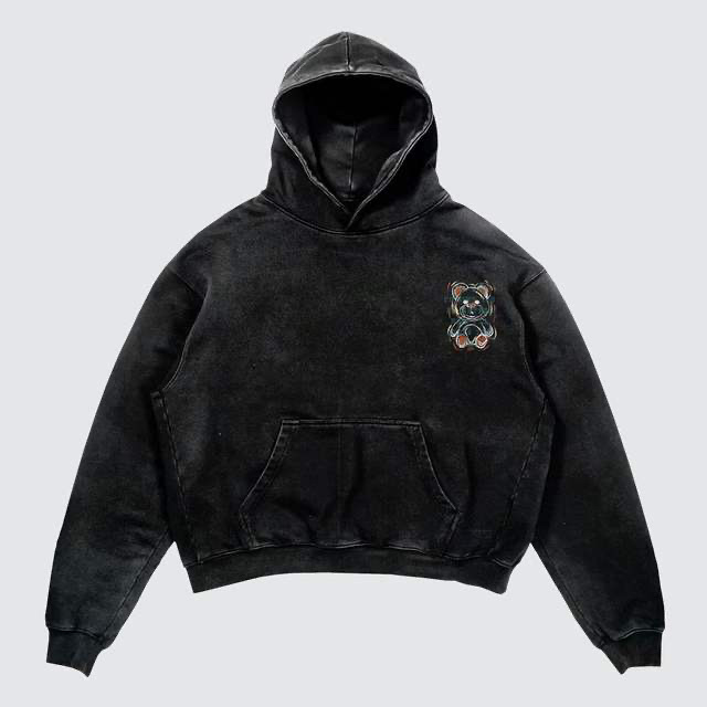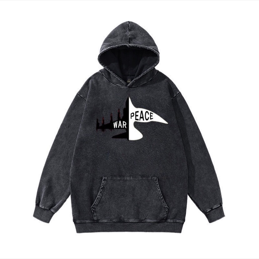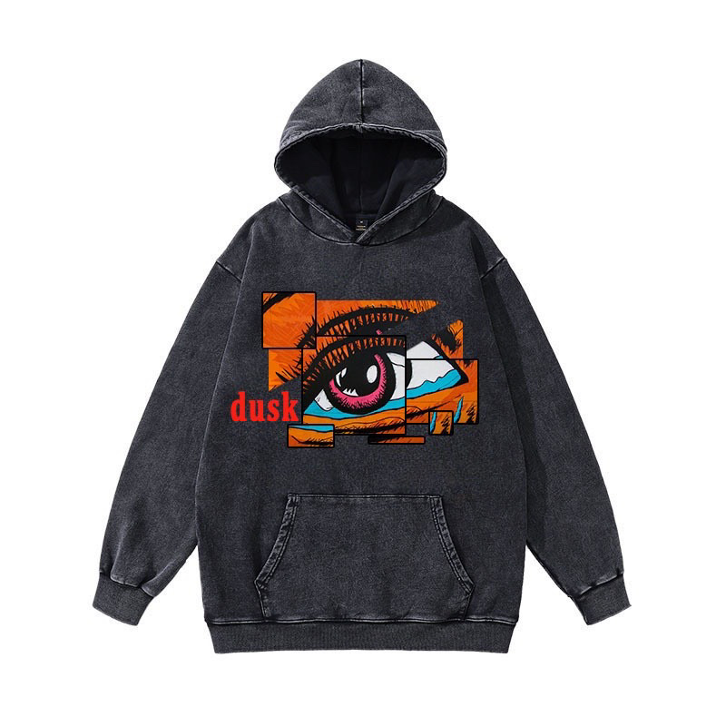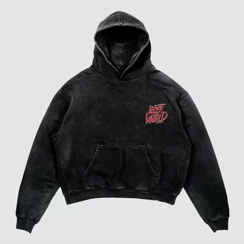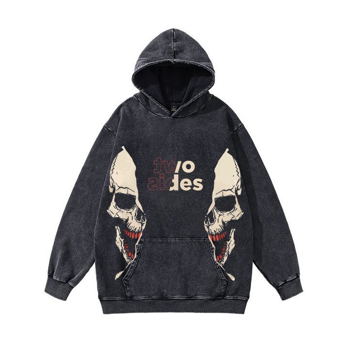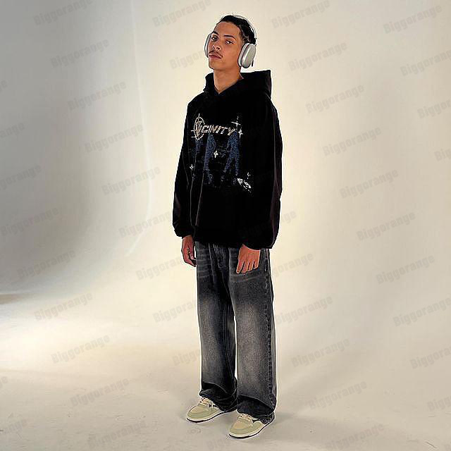 • 뒷면 프린트가 있는 검은색 워싱 후드티