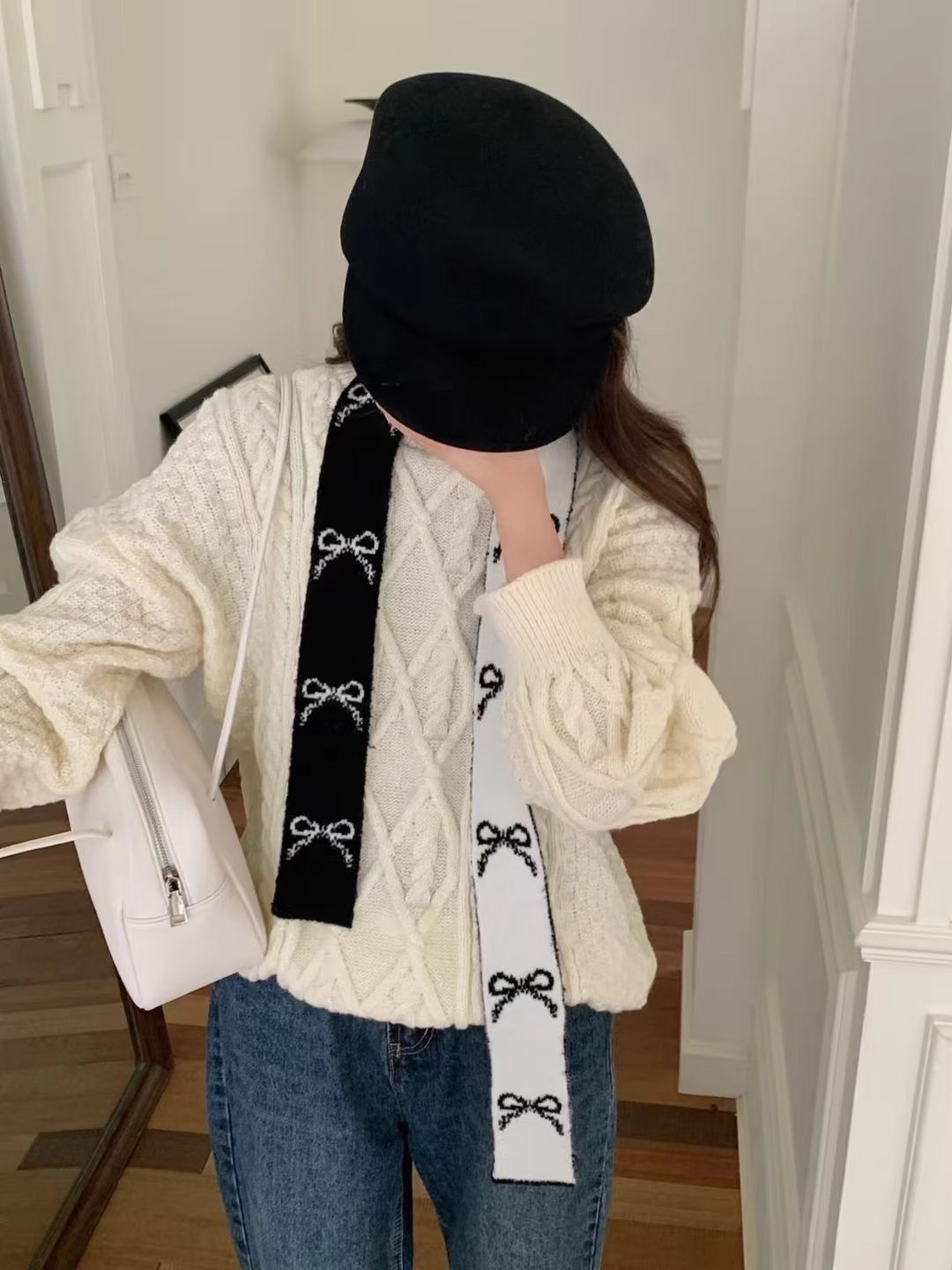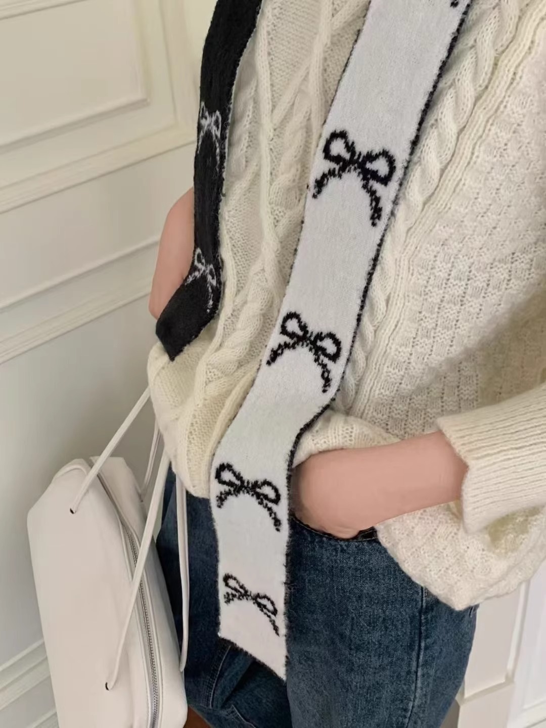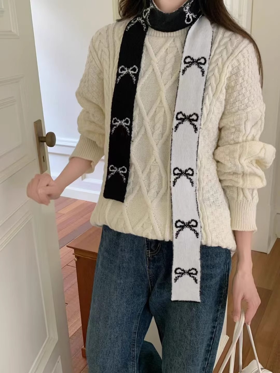 한국 양면 Bowknot 작은 스카프 긴 가을과 겨울 새로운 스타일의 따뜻한 목 여성을위한 매일 장식스토어 가기