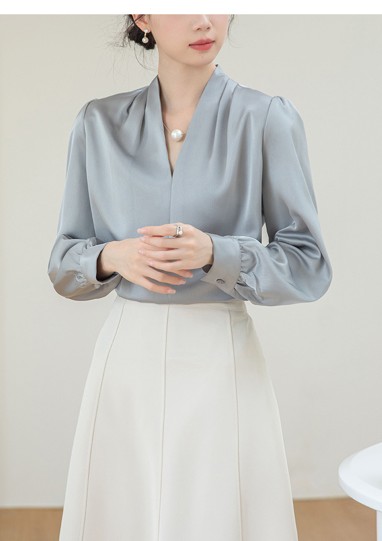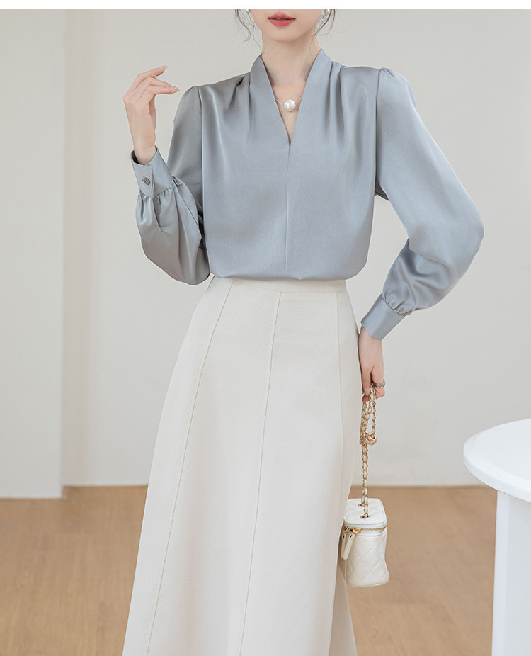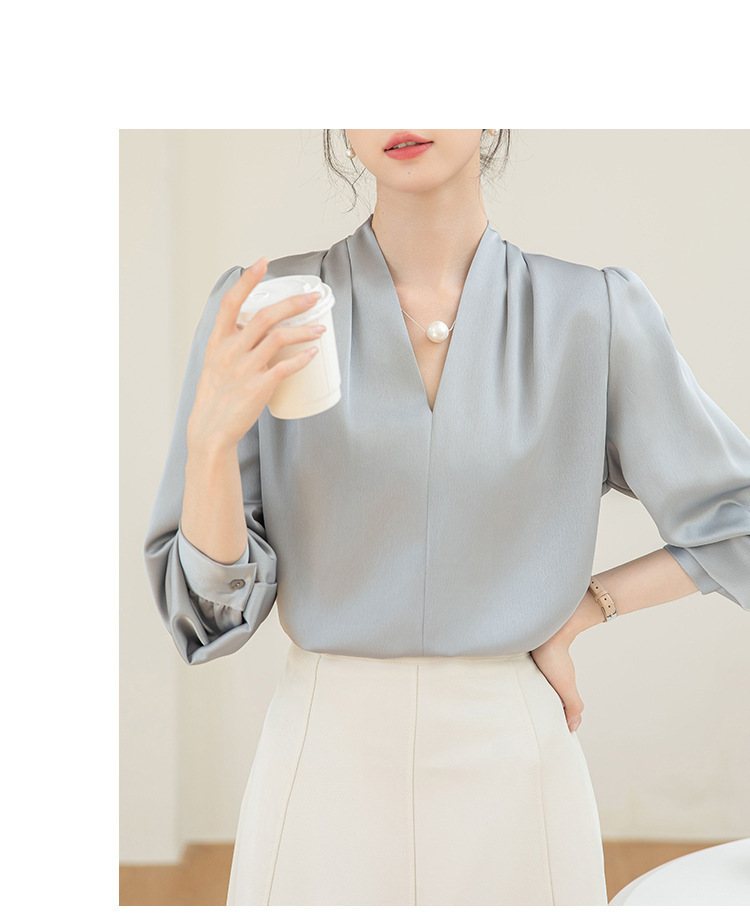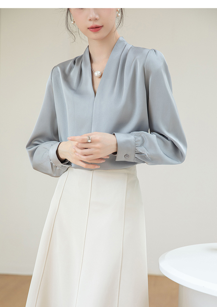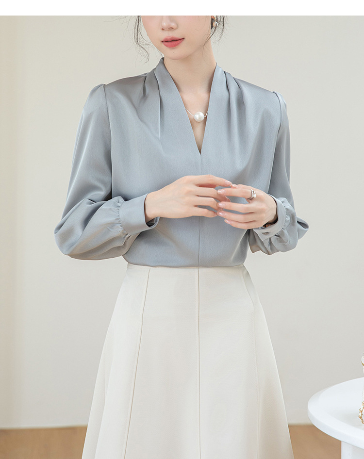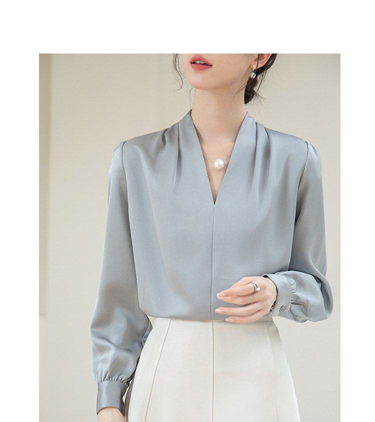 하이 엔드 V 넥 진주 체인 셔츠 여성의 이른 가을 새로운 프랑스 스타일 라이트 성숙한 스타일 통근 전문 셔츠 세련된 서양 스타일