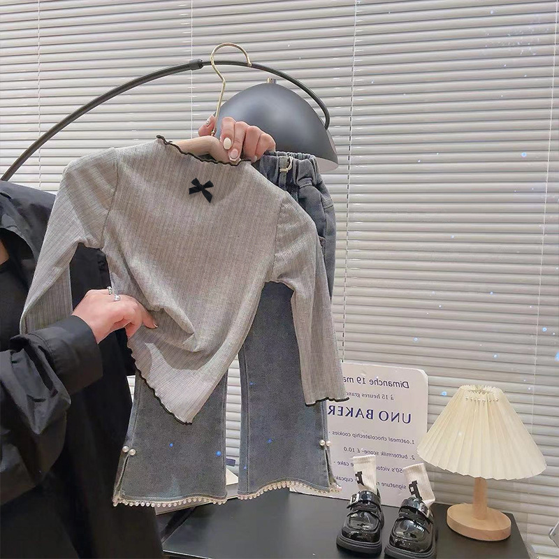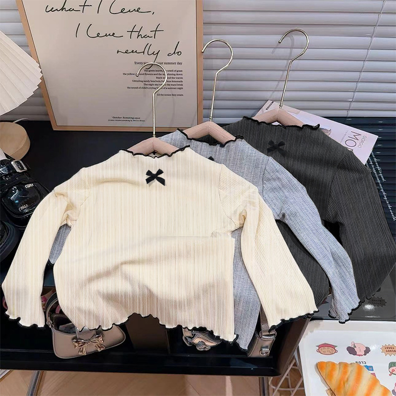 여아용 긴팔 티셔츠, 귀테두리 활 긴소매 탑 2024 가을 새 올매치 보토밍 셔츠스토어 가기