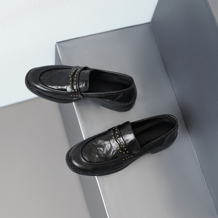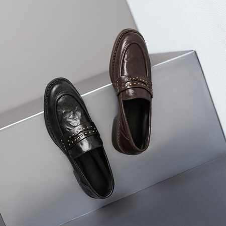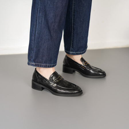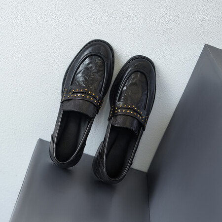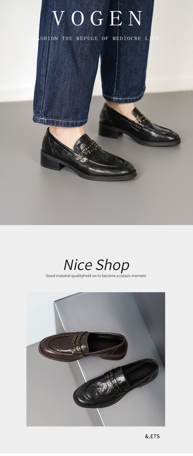 양가죽 주름 복고풍 둥근 발가락 리벳 중간 굽 통근 검은색 작업 신발 한쪽 다리 작은 가죽 신발 두꺼운 굽 여성 신발스토어 가기