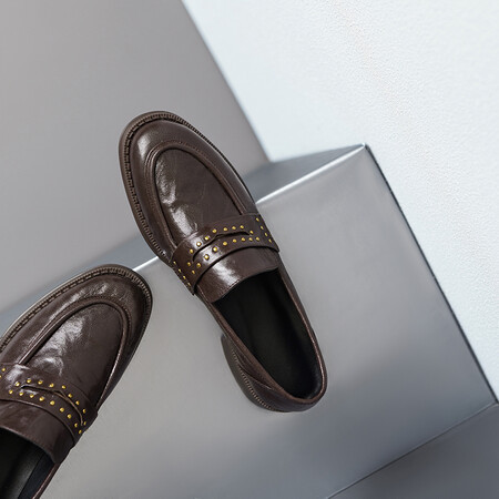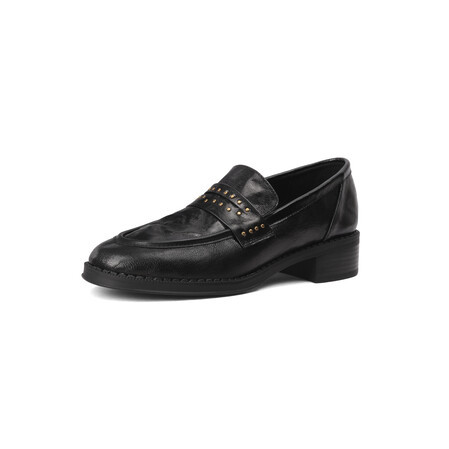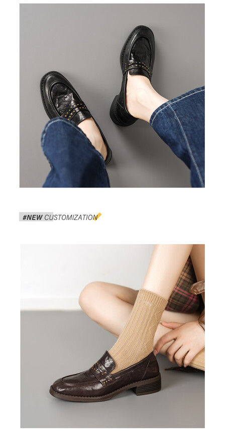 양가죽 주름 복고풍 둥근 발가락 리벳 중간 굽 통근 검은색 작업 신발 한쪽 다리 작은 가죽 신발 두꺼운 굽 여성 신발