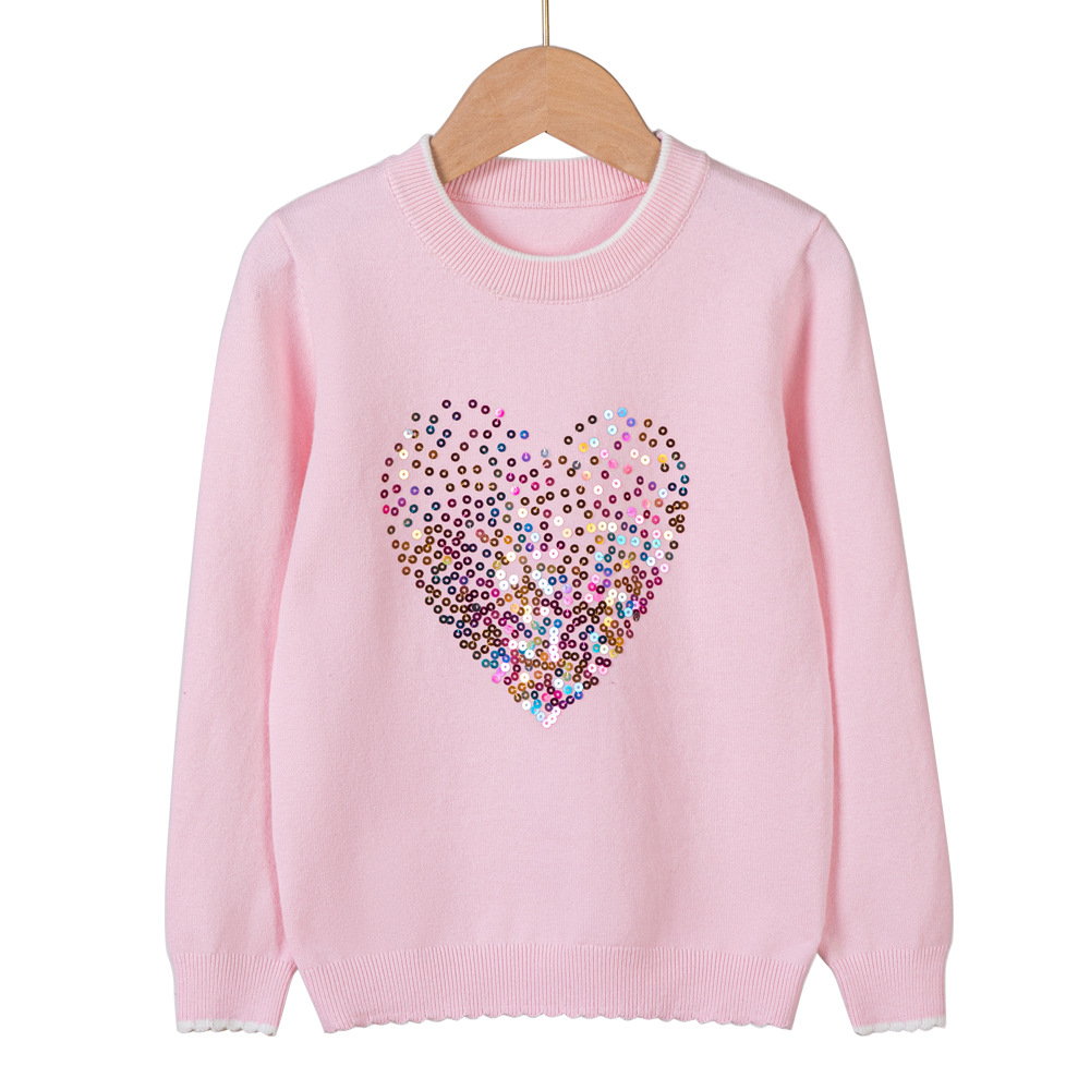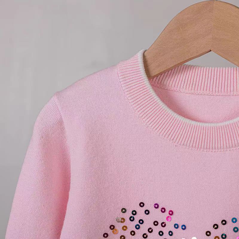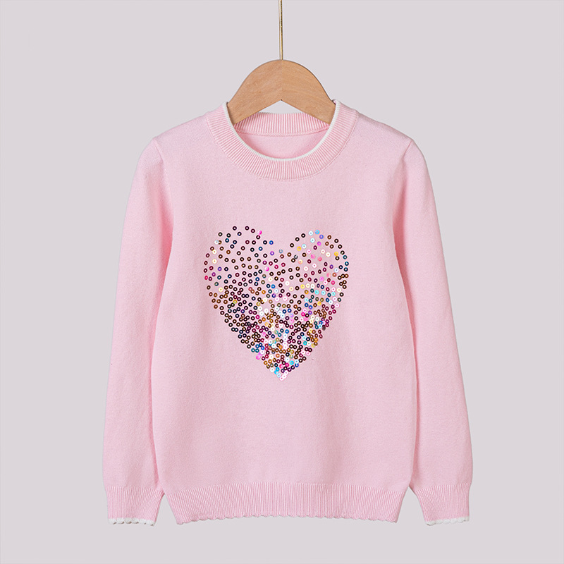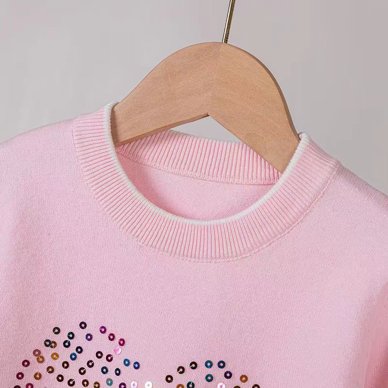 2024 년 봄 가을 아동복 라운드 넥 러브 스팽글 어린이 스웨터 소녀 니트 베이스 셔츠 제조 업체 도매스토어 가기