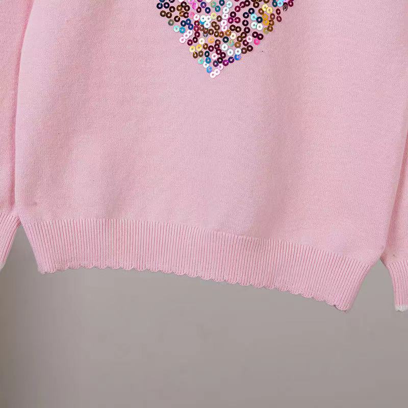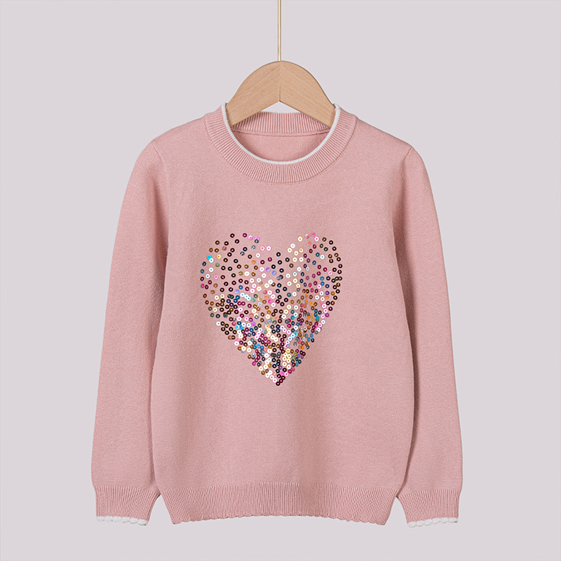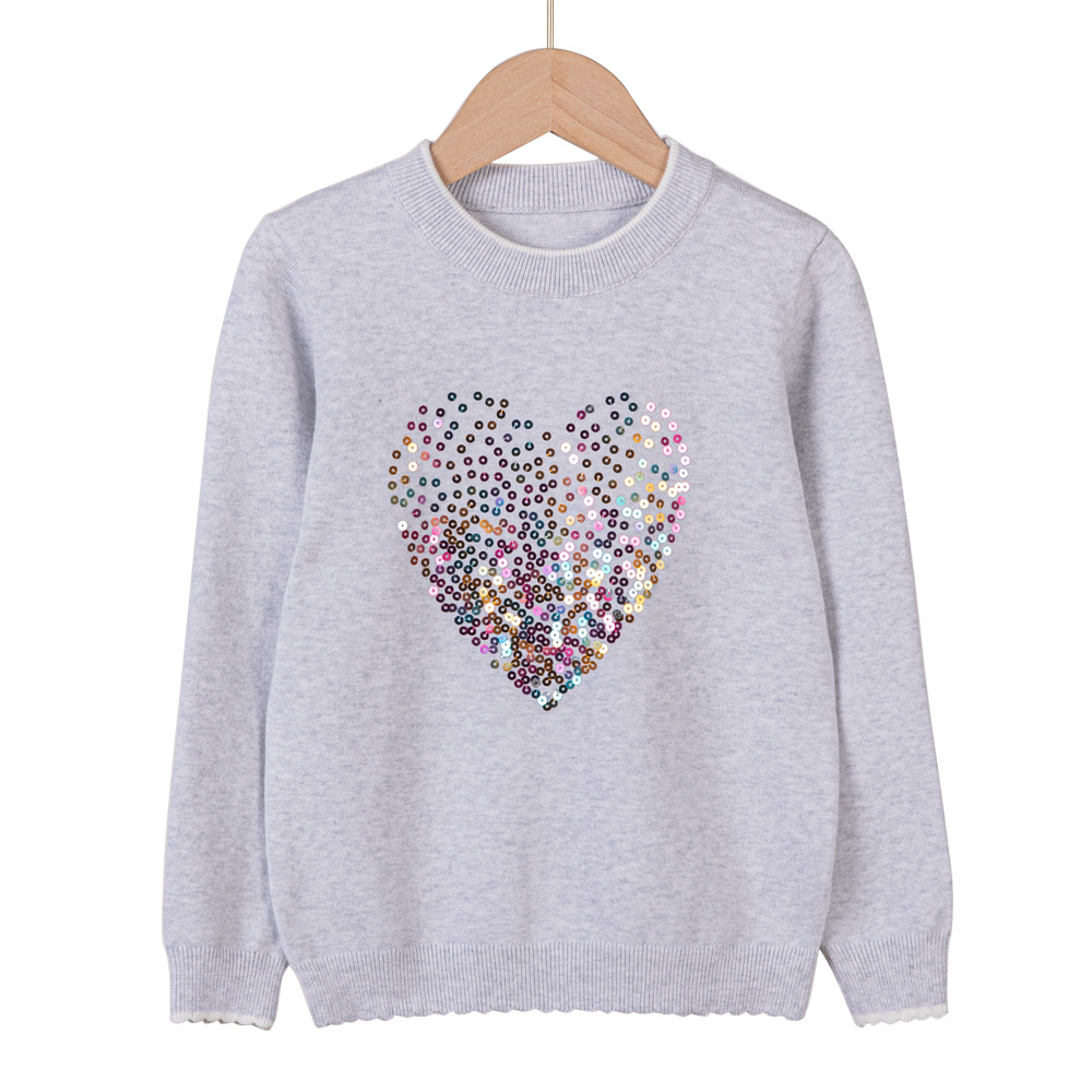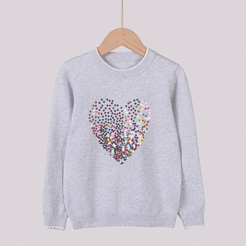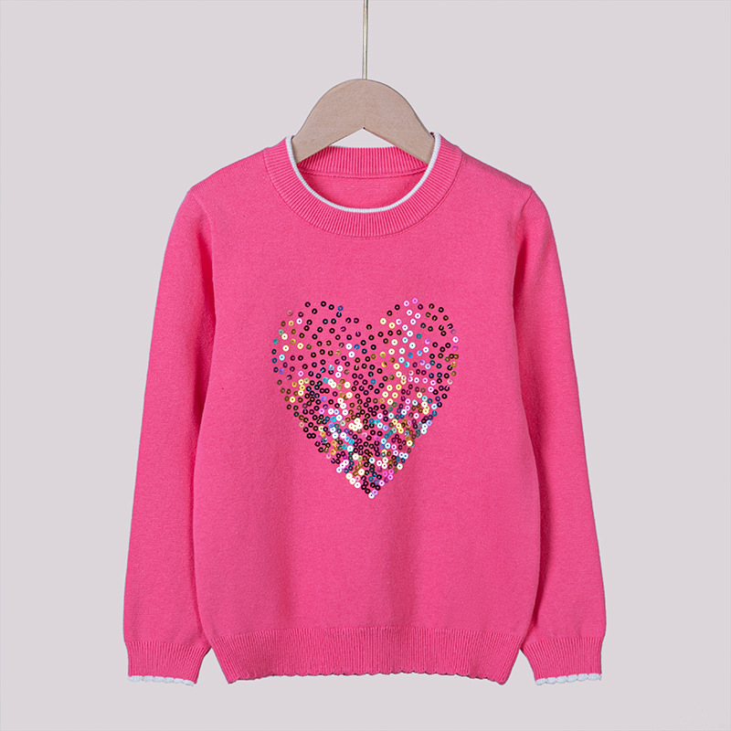 2024 년 봄 가을 아동복 라운드 넥 러브 스팽글 어린이 스웨터 소녀 니트 베이스 셔츠 제조 업체 도매스토어 가기