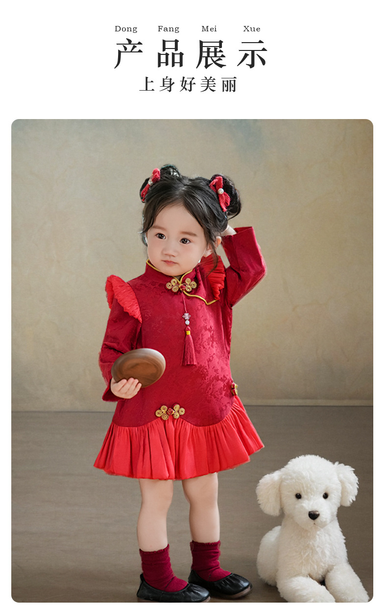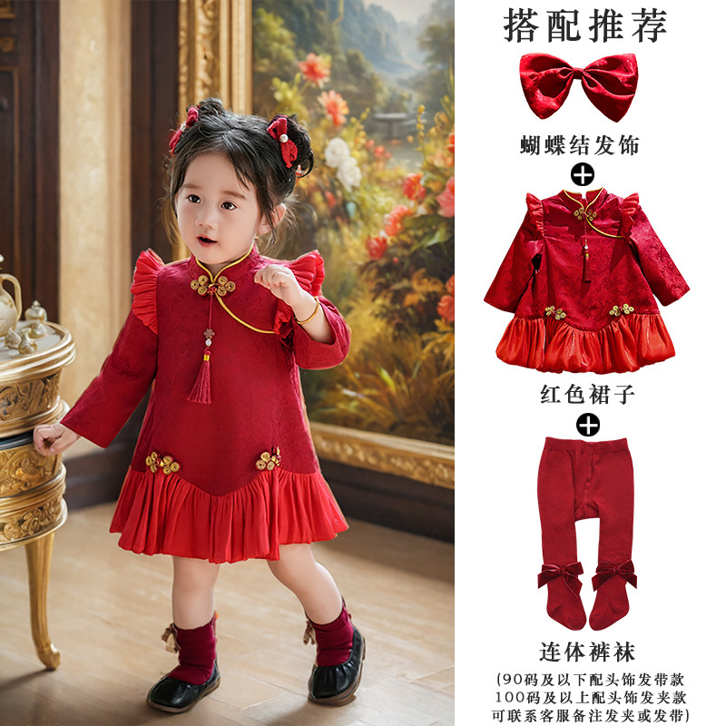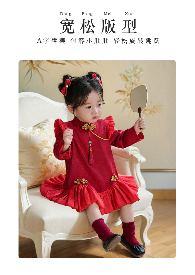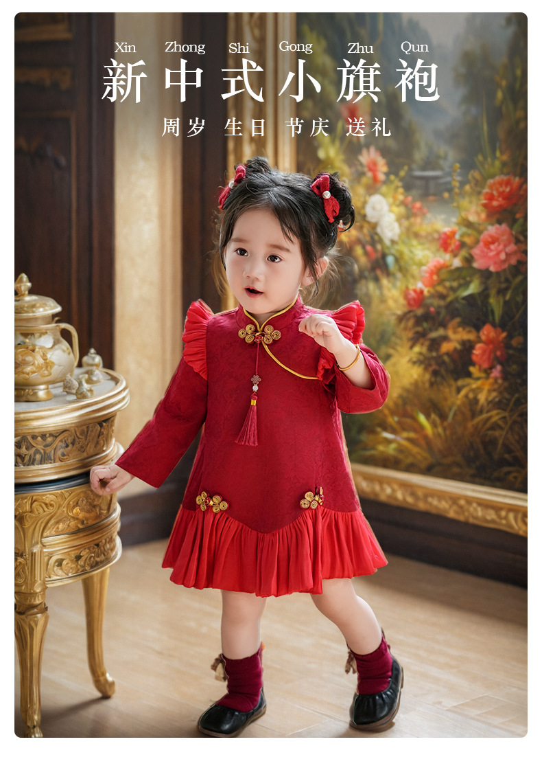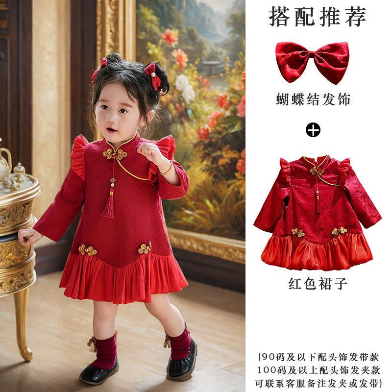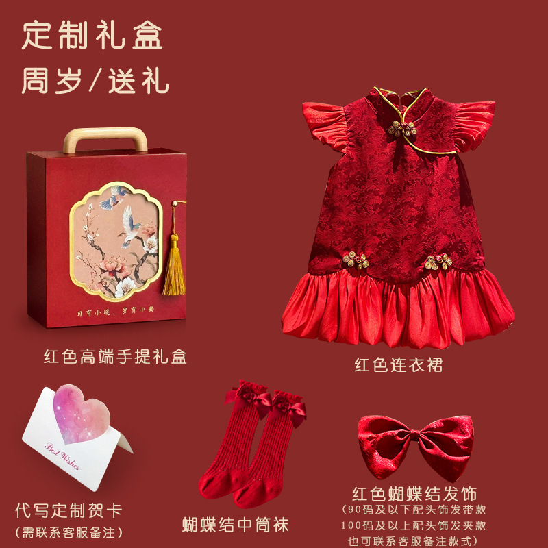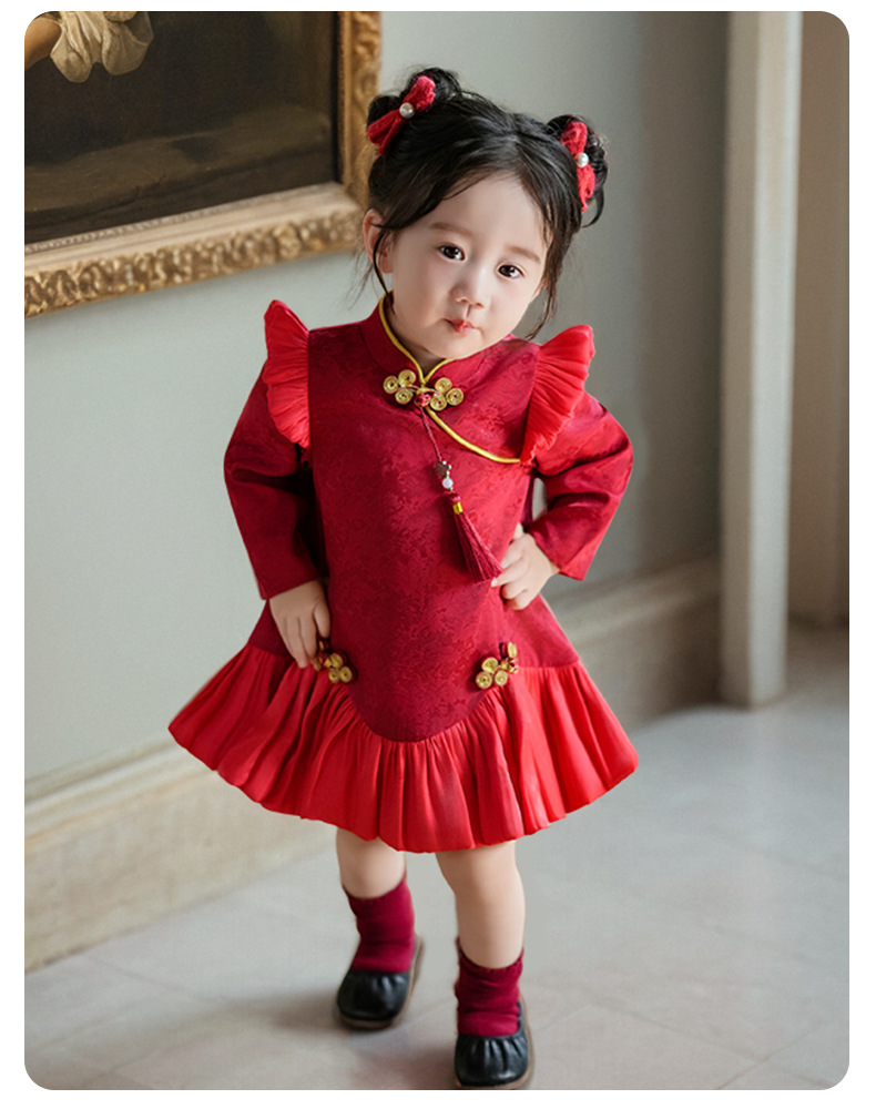 여아 드레스, 새로운 중국 스타일의 봄 여름 긴팔 빨간색 축제 한살 드레스, 여자 아기의 첫 생일 드레스, 치파오 공주 드레스스토어 가기