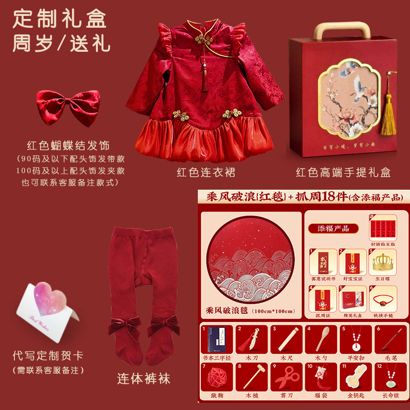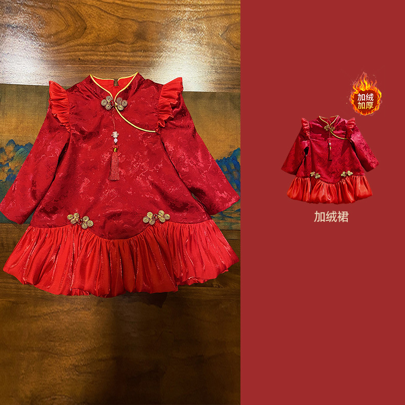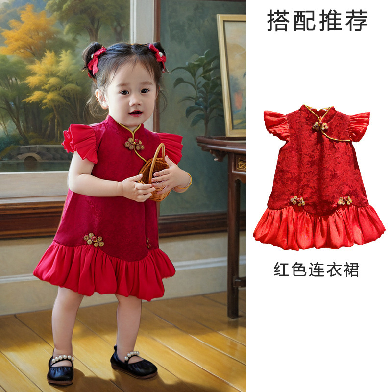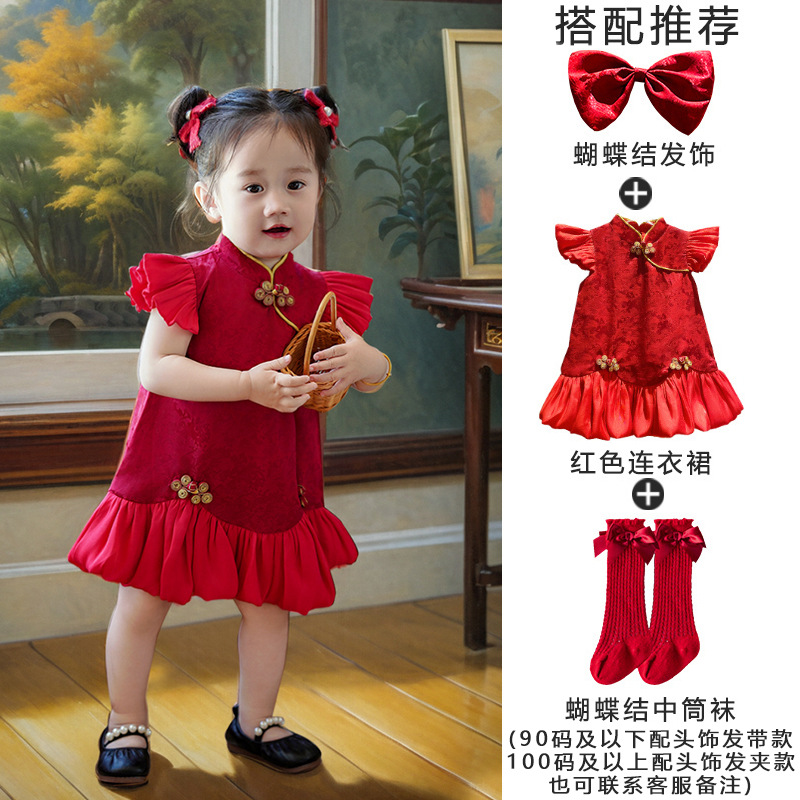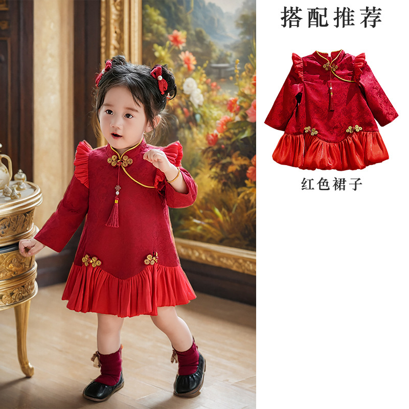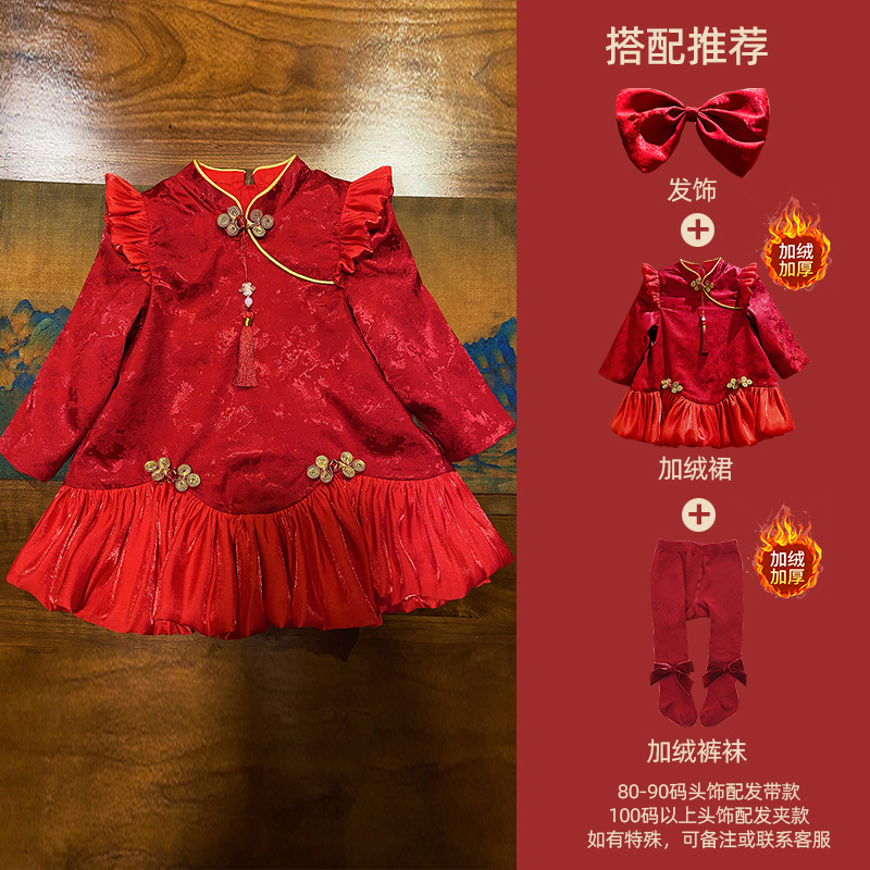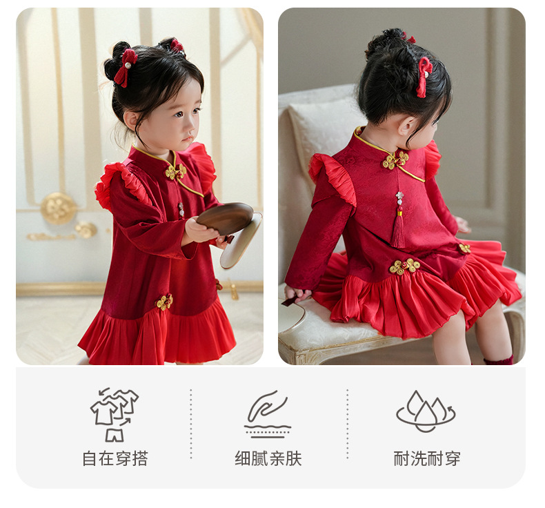 여아 드레스, 새로운 중국 스타일의 봄 여름 긴팔 빨간색 축제 한살 드레스, 여자 아기의 첫 생일 드레스, 치파오 공주 드레스스토어 가기