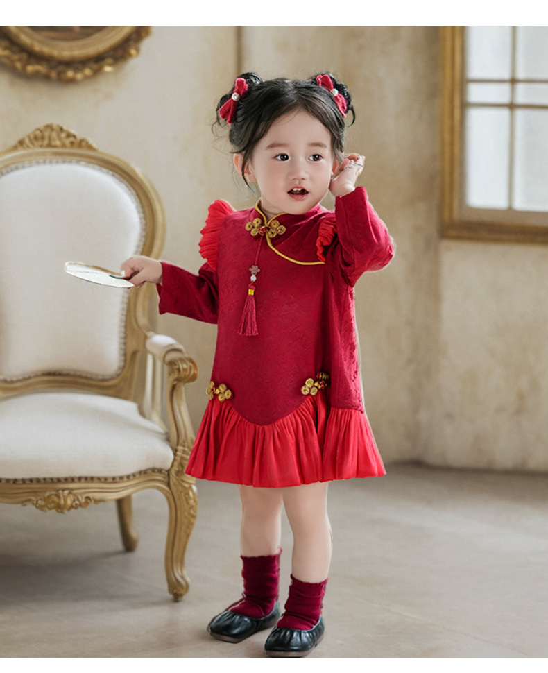 여아 드레스, 새로운 중국 스타일의 봄 여름 긴팔 빨간색 축제 한살 드레스, 여자 아기의 첫 생일 드레스, 치파오 공주 드레스