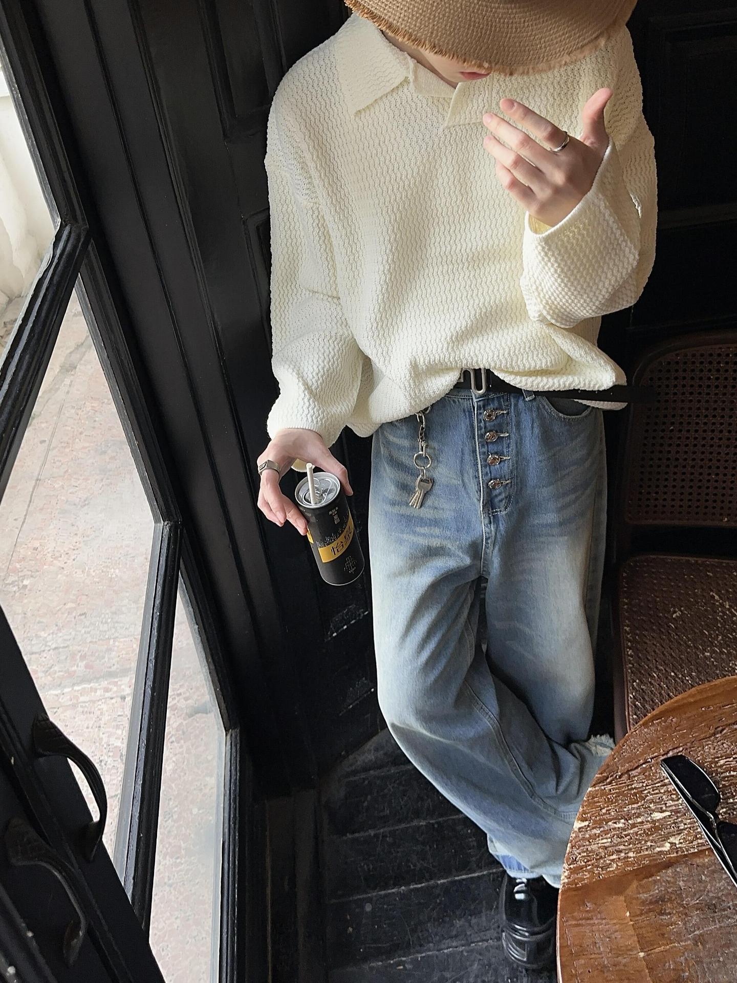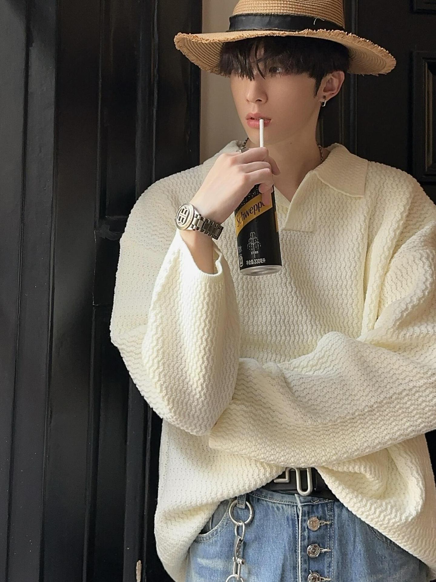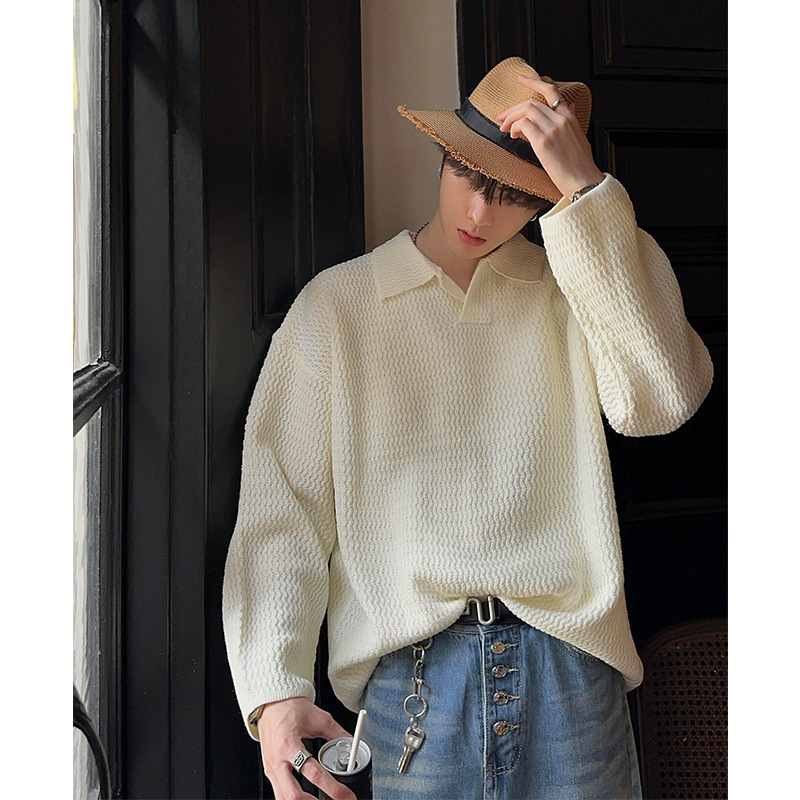 살구색 긴팔 니트 폴로 셔츠 남자 게으른 한국식 분위기 탑 하이 엔드 옷깃 스웨터 착용스토어 가기