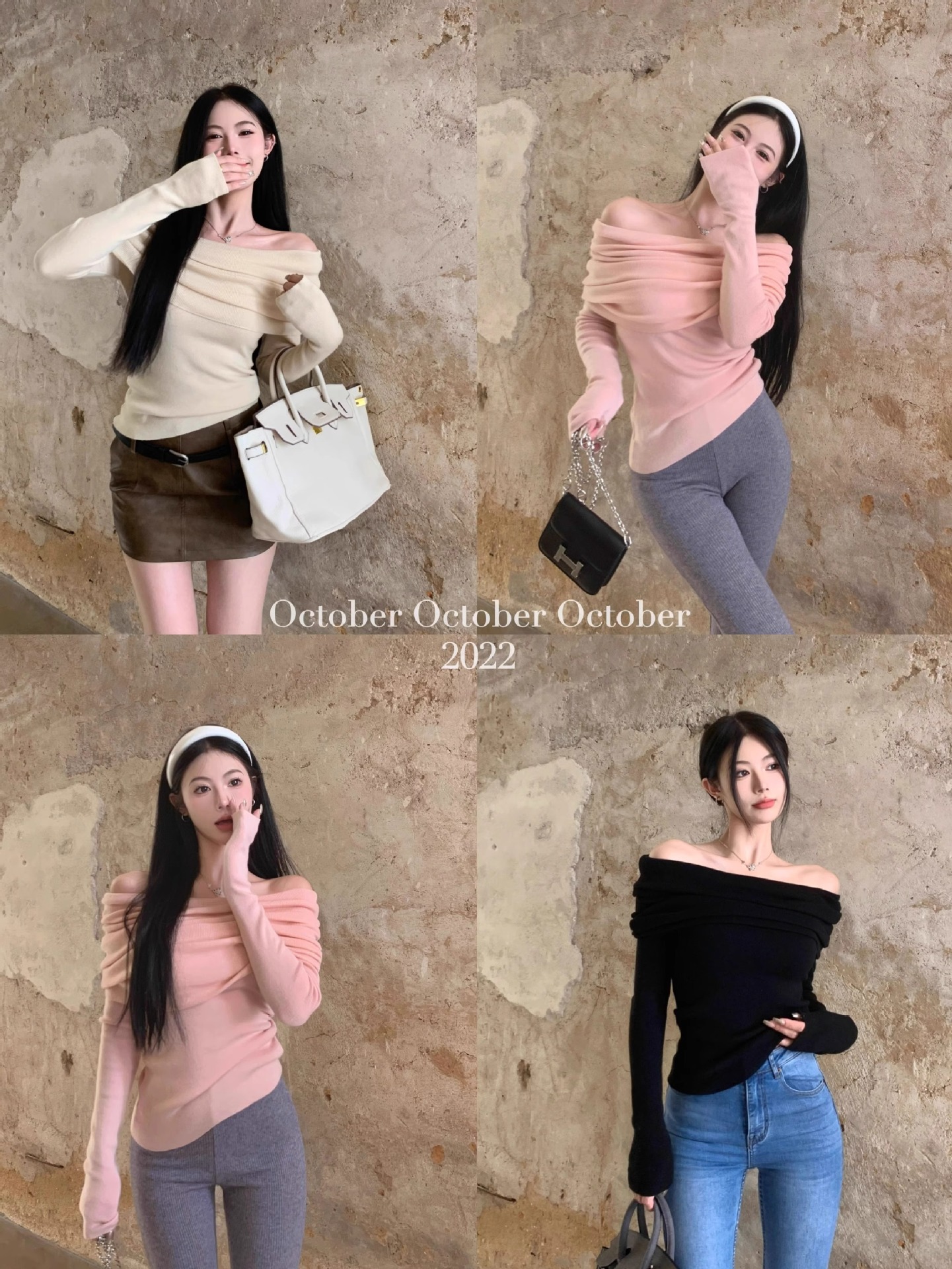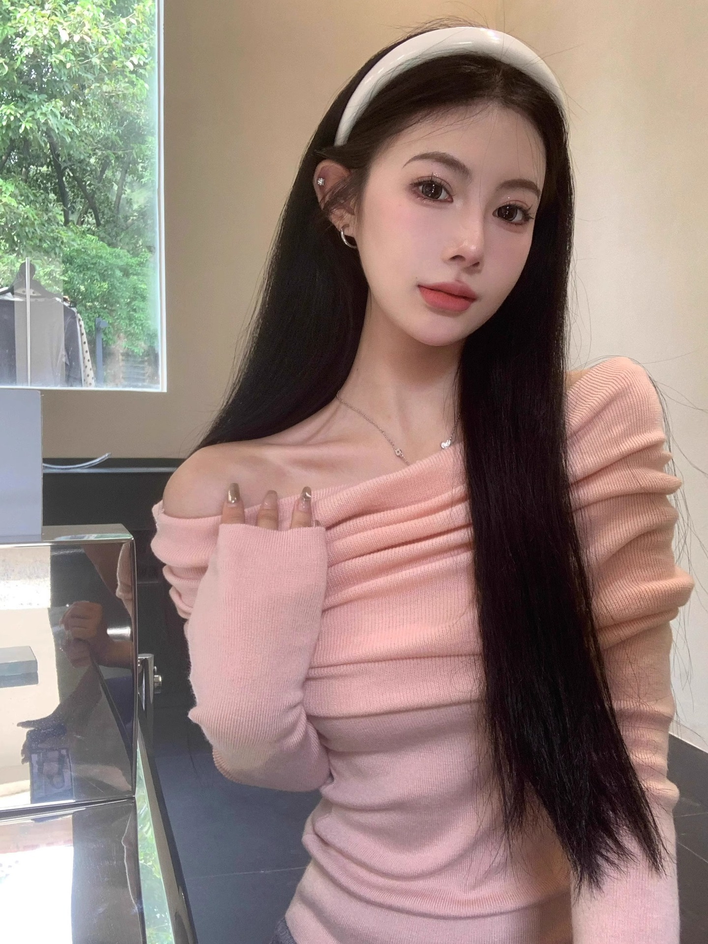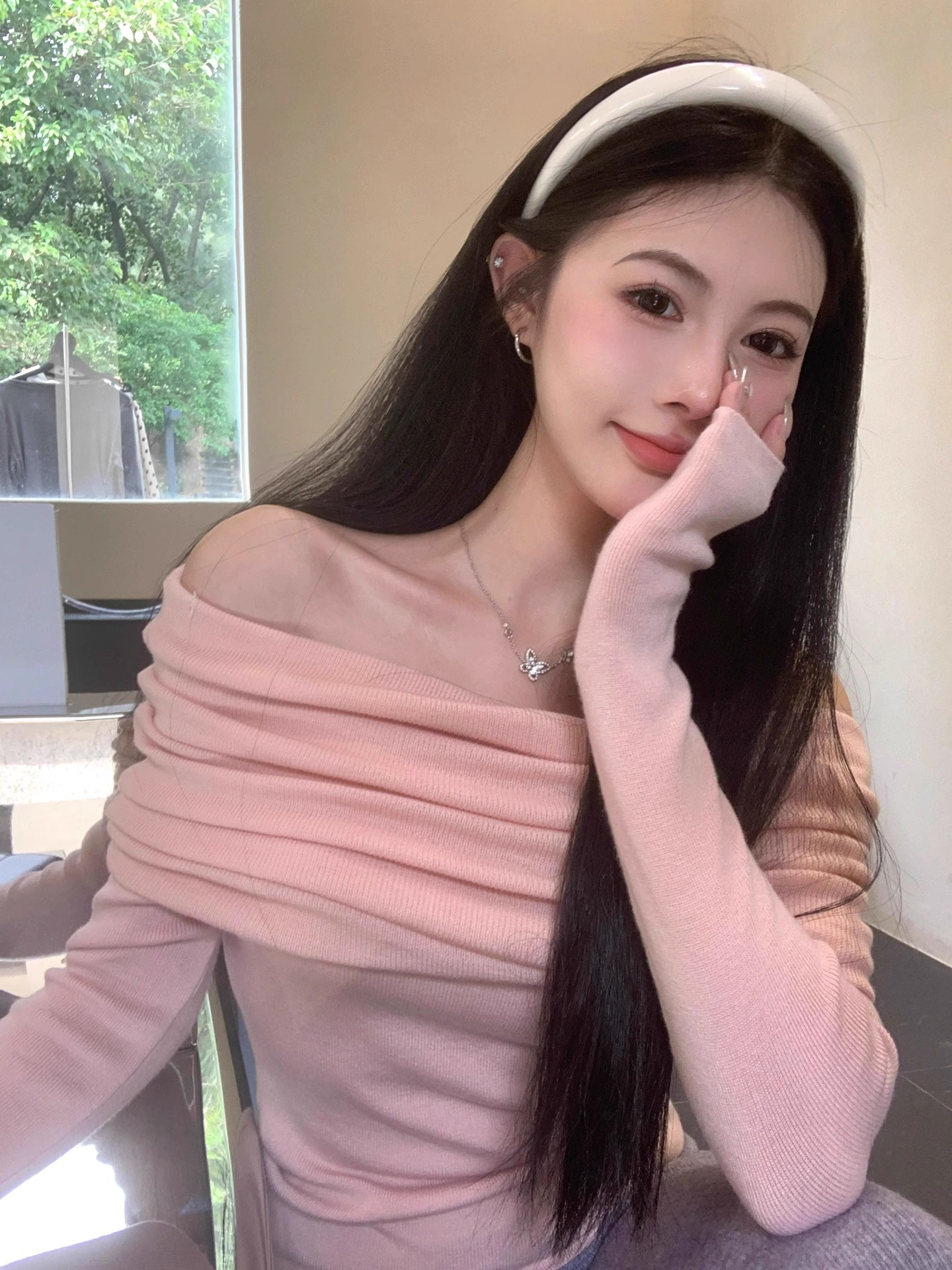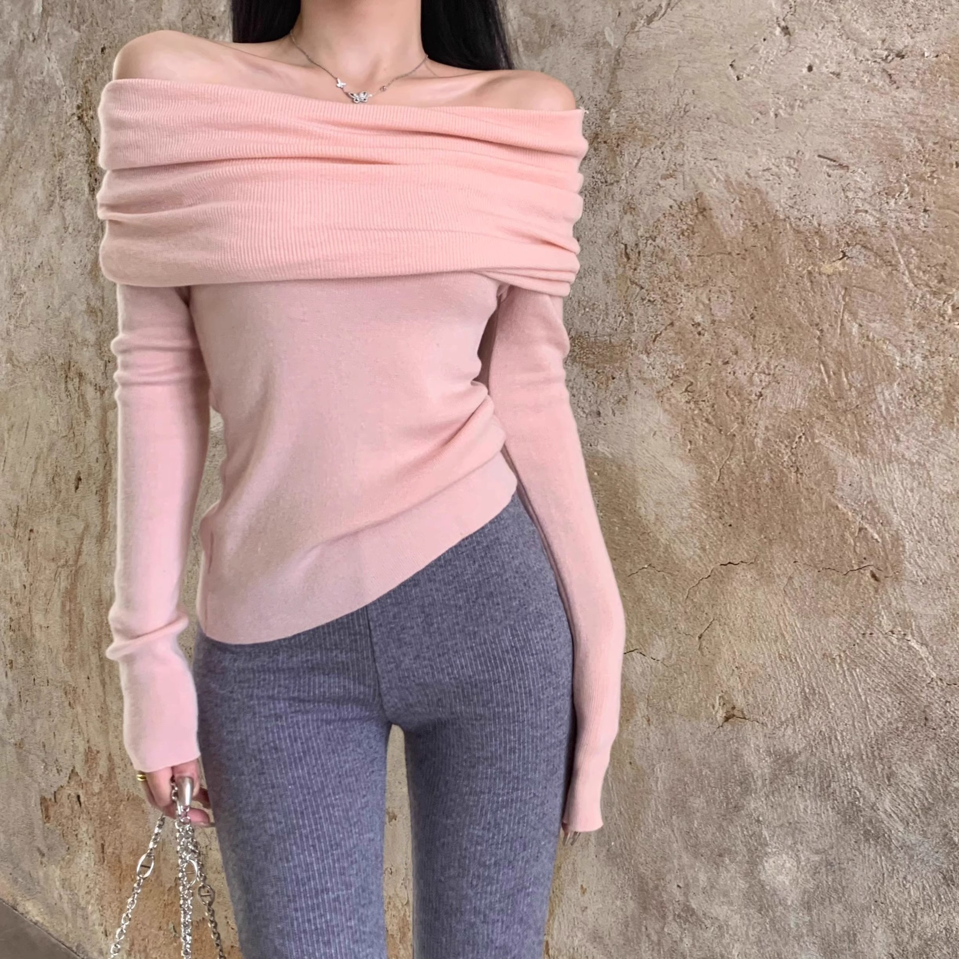 순수한 욕망 어깨 쇄골 긴팔 어깨 니트 스웨터 여성의 봄과 가을 칼라베이스 셔츠 아우터 탑