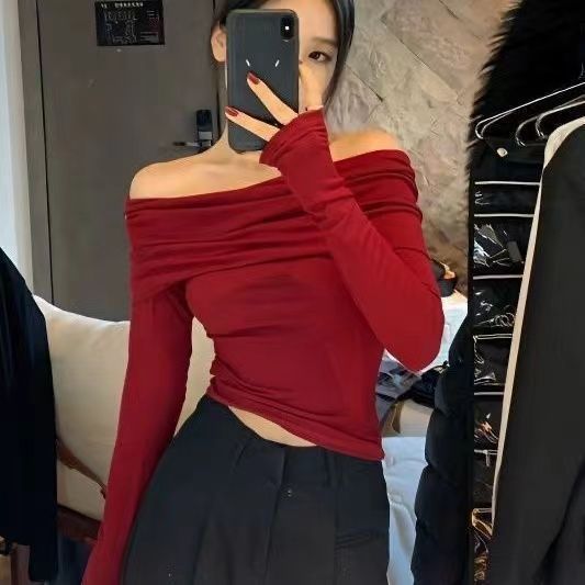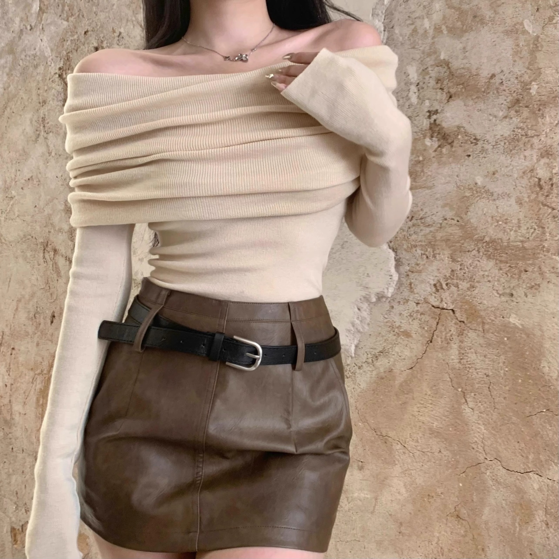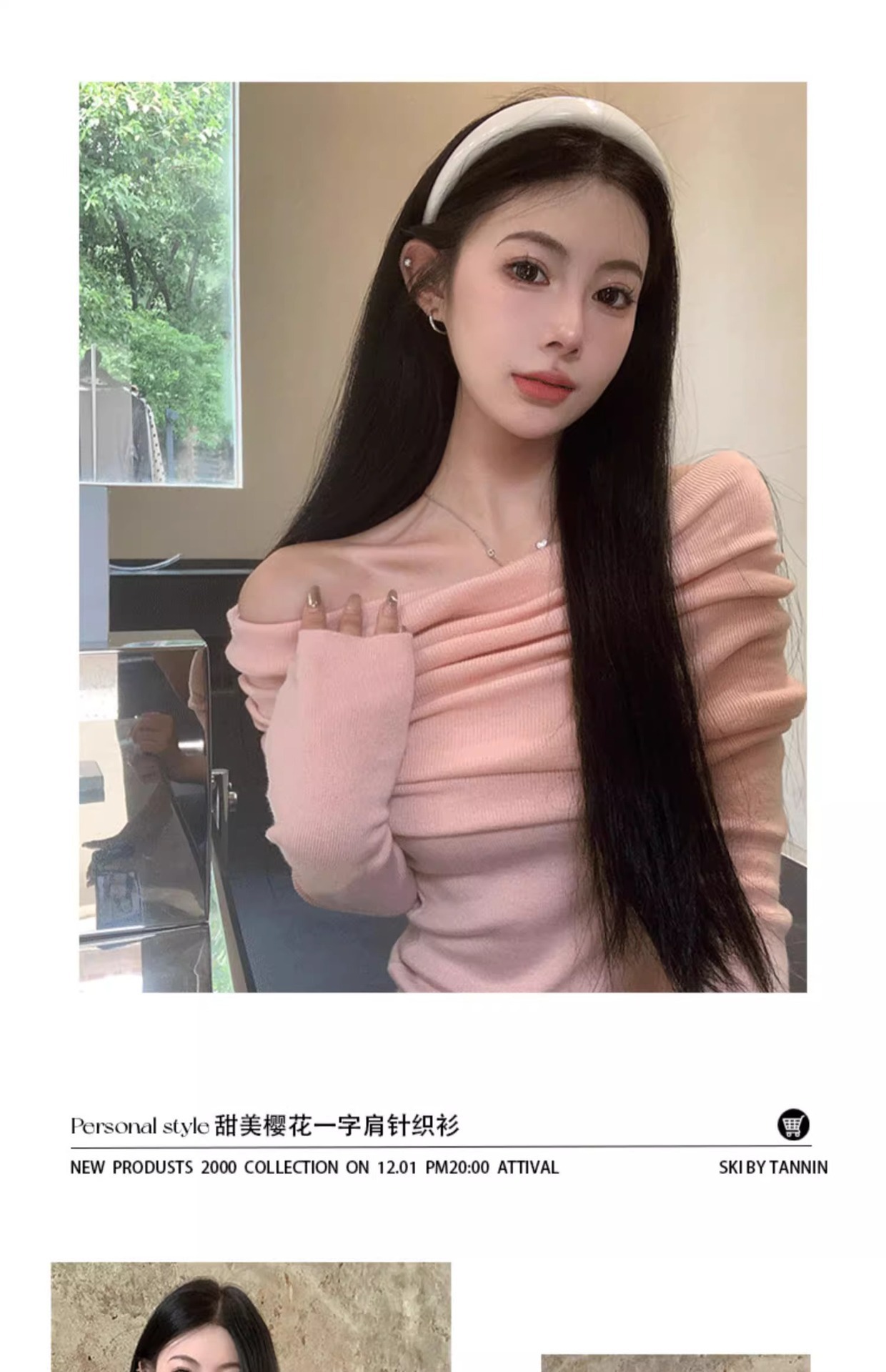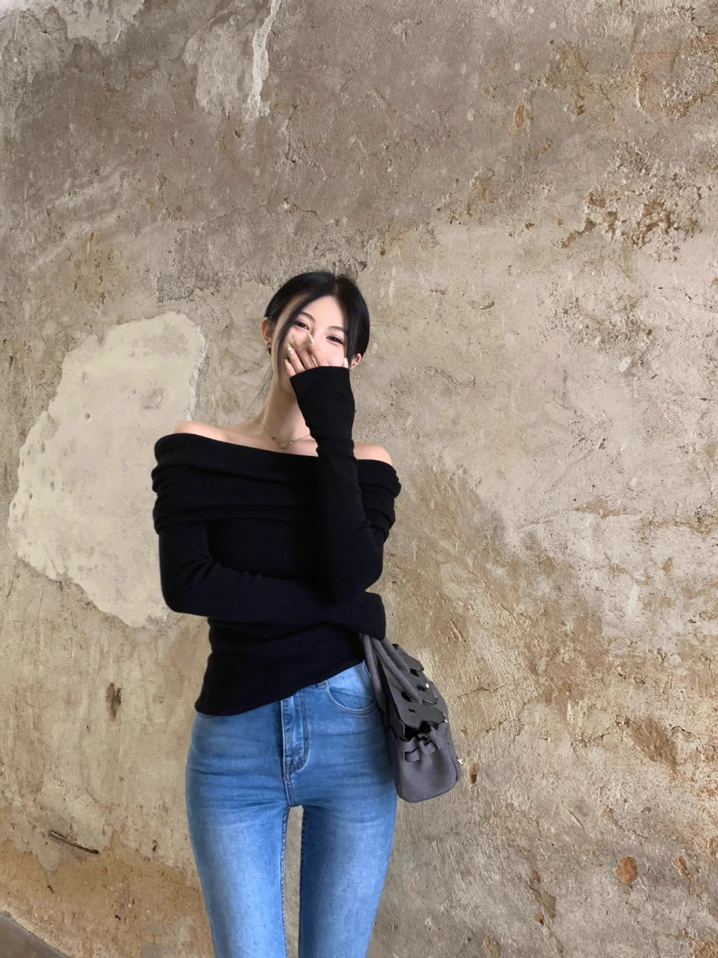순수한 욕망 어깨 쇄골 긴팔 어깨 니트 스웨터 여성의 봄과 가을 칼라베이스 셔츠 아우터 탑