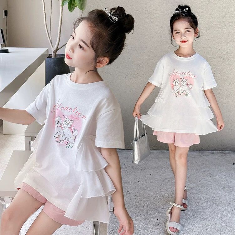 여자 반소매 티셔츠 원피스 2025 년 새 여름 어린이 세련된 패셔너블 스커트 여름 소녀의 반소매 탑 트렌디