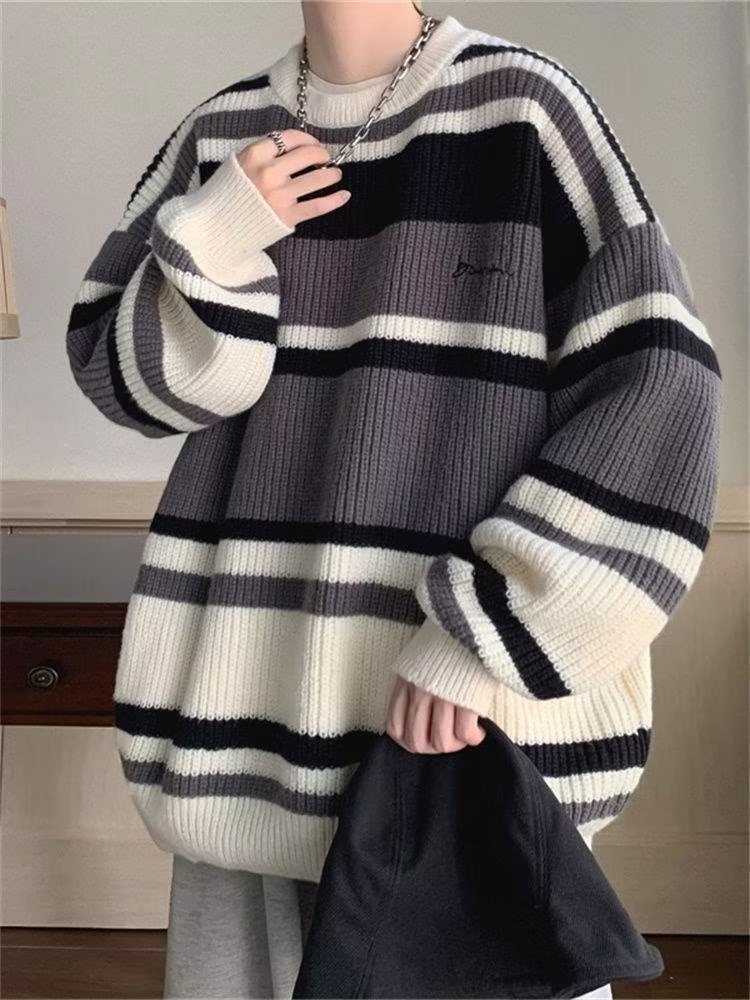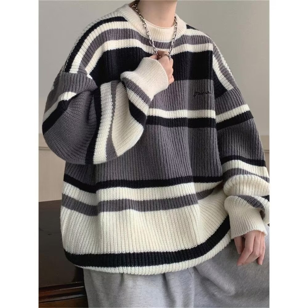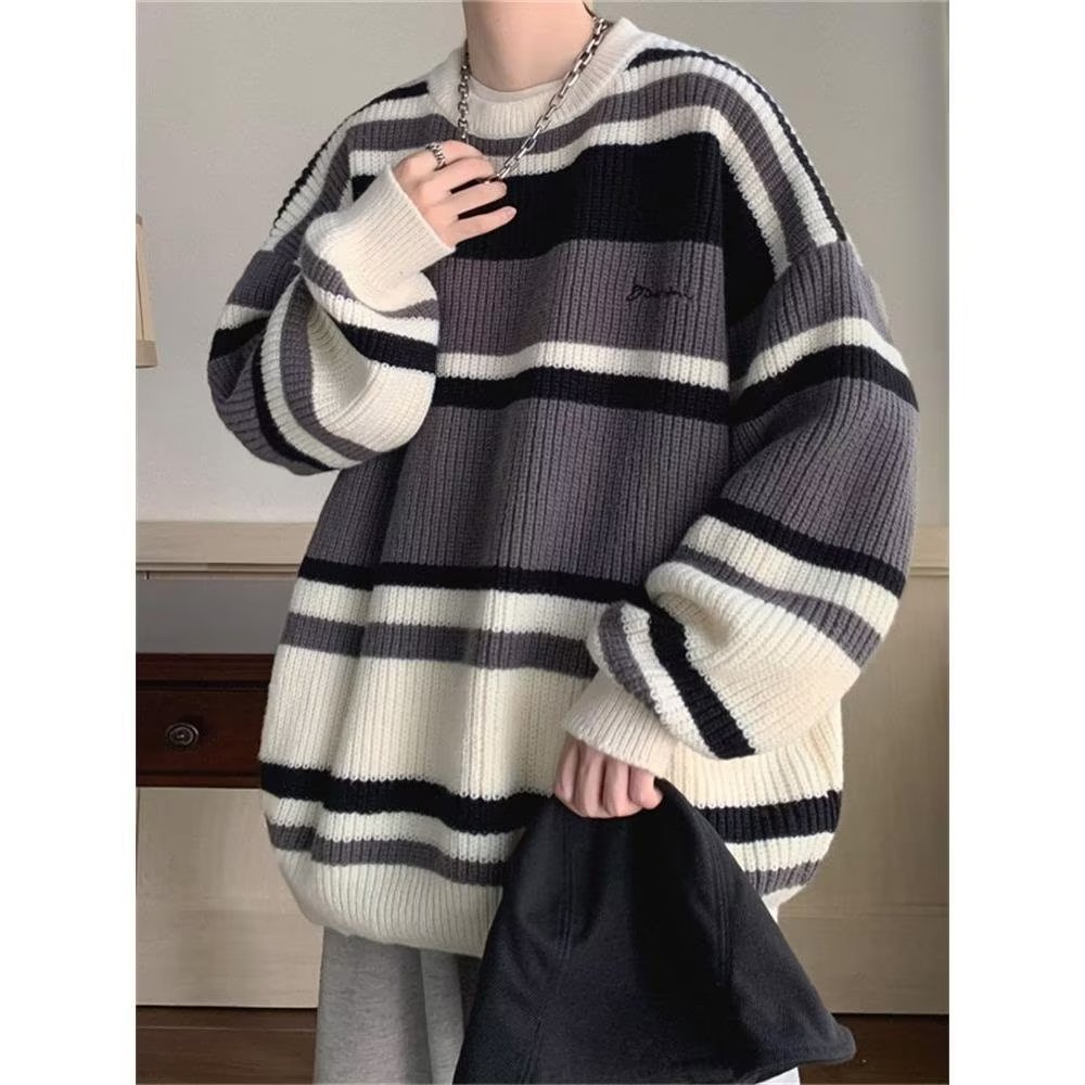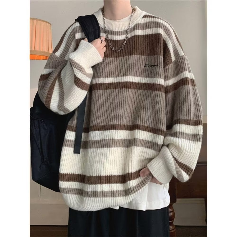 스웨터 남자 일본 스타일 레트로 스트라이프 콘트라스트베이스 셔츠 스웨터 가을과 겨울 새로운 유행 브랜드 루즈 스웨터 재킷