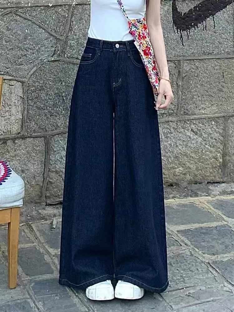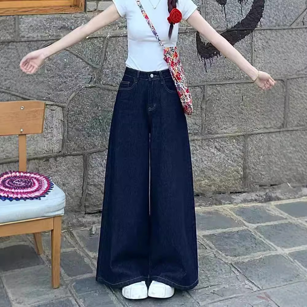 우아한 높은 허리 넓은 다리 다크 블루 청바지 여성의 새로운 스트레이트 튜브 느슨한 캐주얼 간단한 통근 댐핑 바지